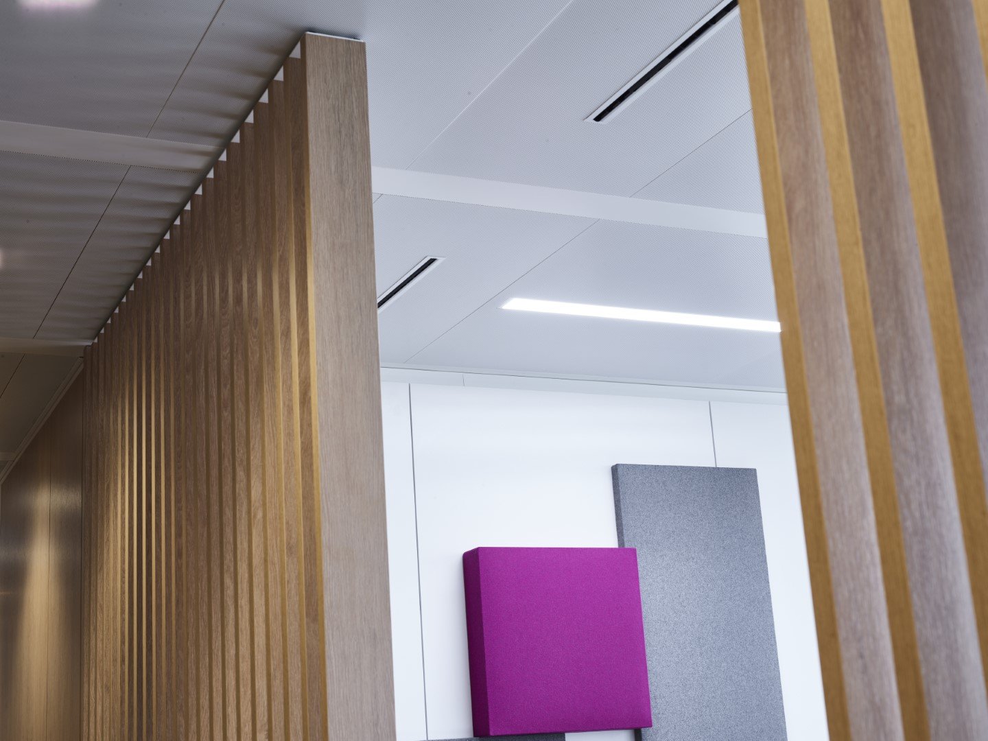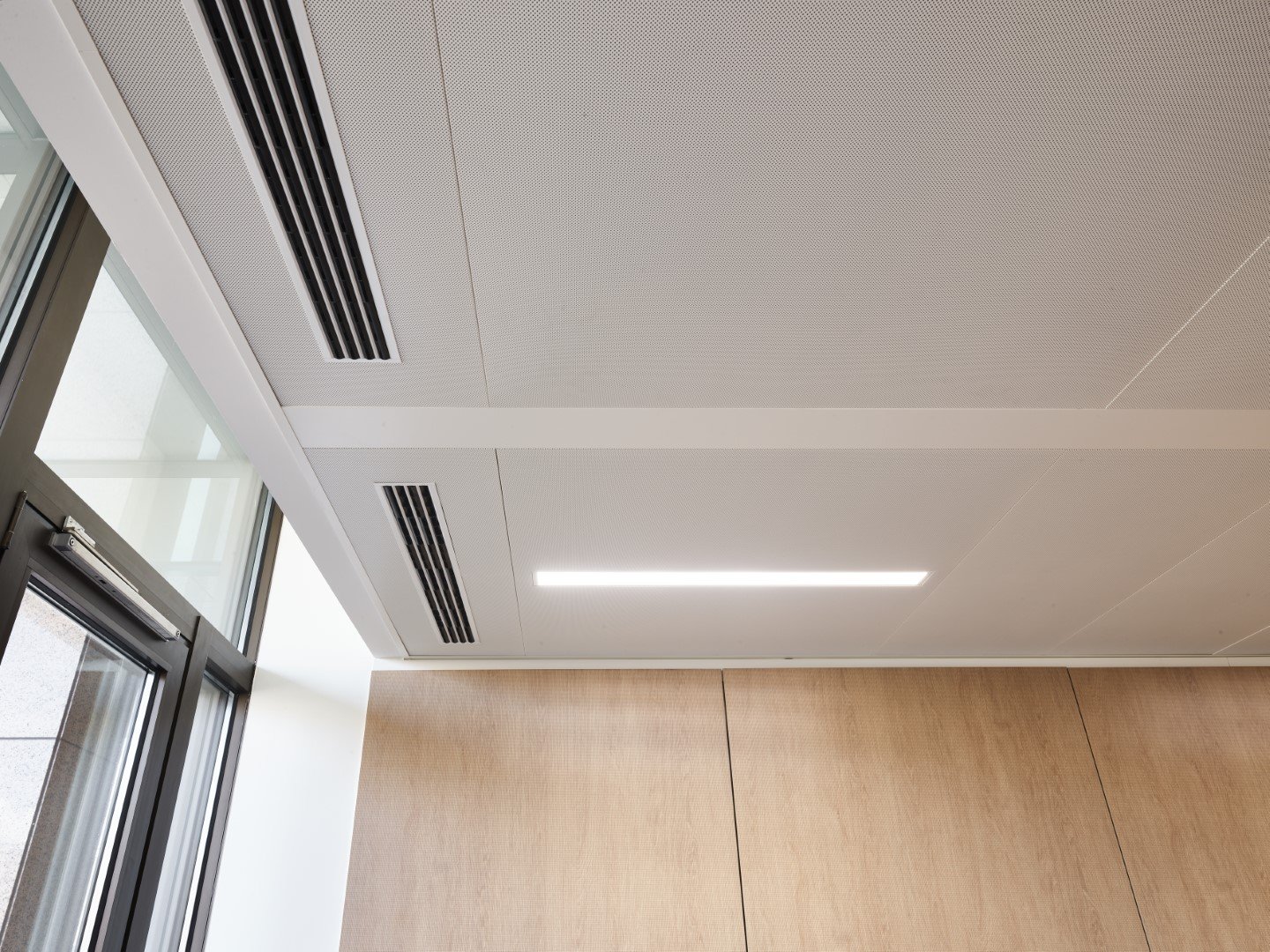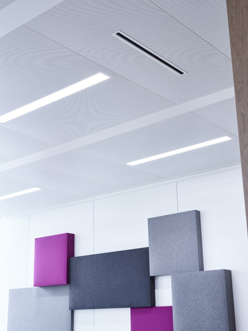 Pour les faux-plafonds, le choix s'est porté sur des plafonds climatiques JB COOL à cassettes métalliques.