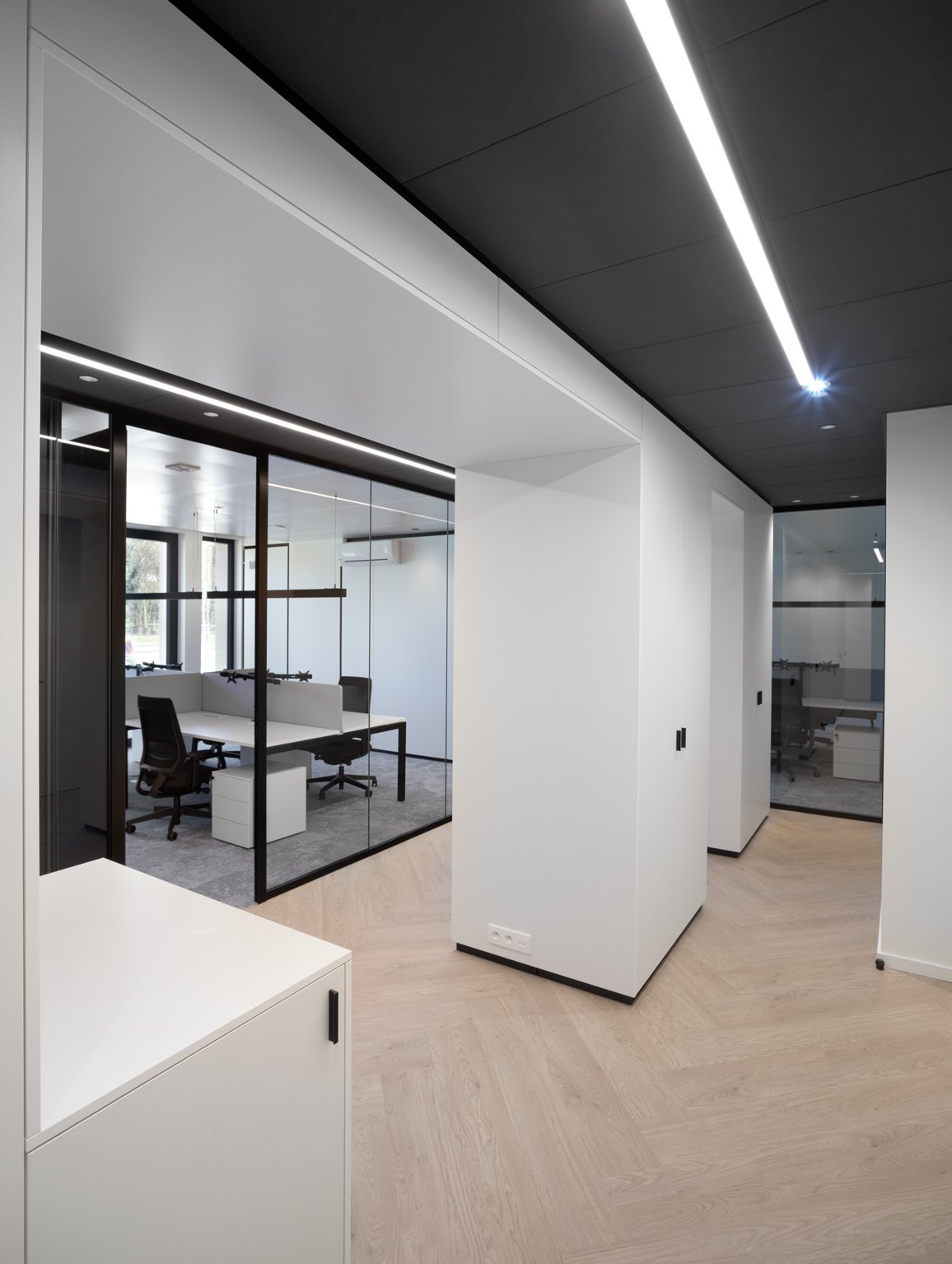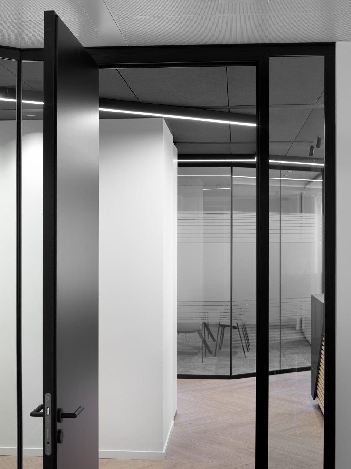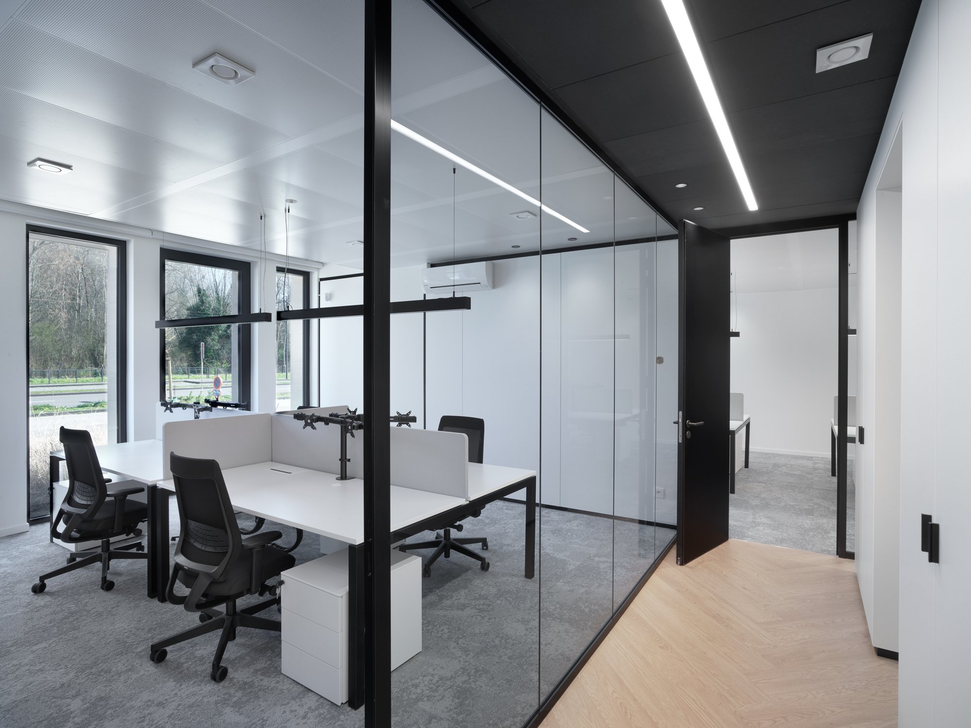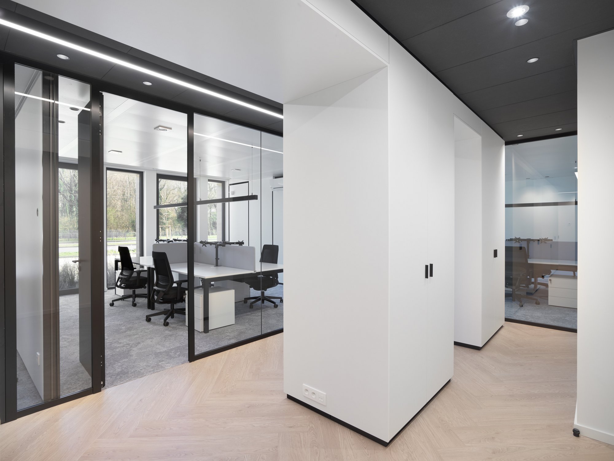 Outre la fourniture et l'installation de nos propres produits, tels que les cloisons pleines JB 2000, les cloisons vitées JB 4000 et les ensembles de portes JB DOOR, Beddeleem s'est également chargé de l'installation de tous les plafonds métalliques, des finitions de sol, de la peinture, du mobilier (sur mesure), de la réalisation de la cuisine et de l'électricité, l'éclairage, la climatisation et la plomberie.