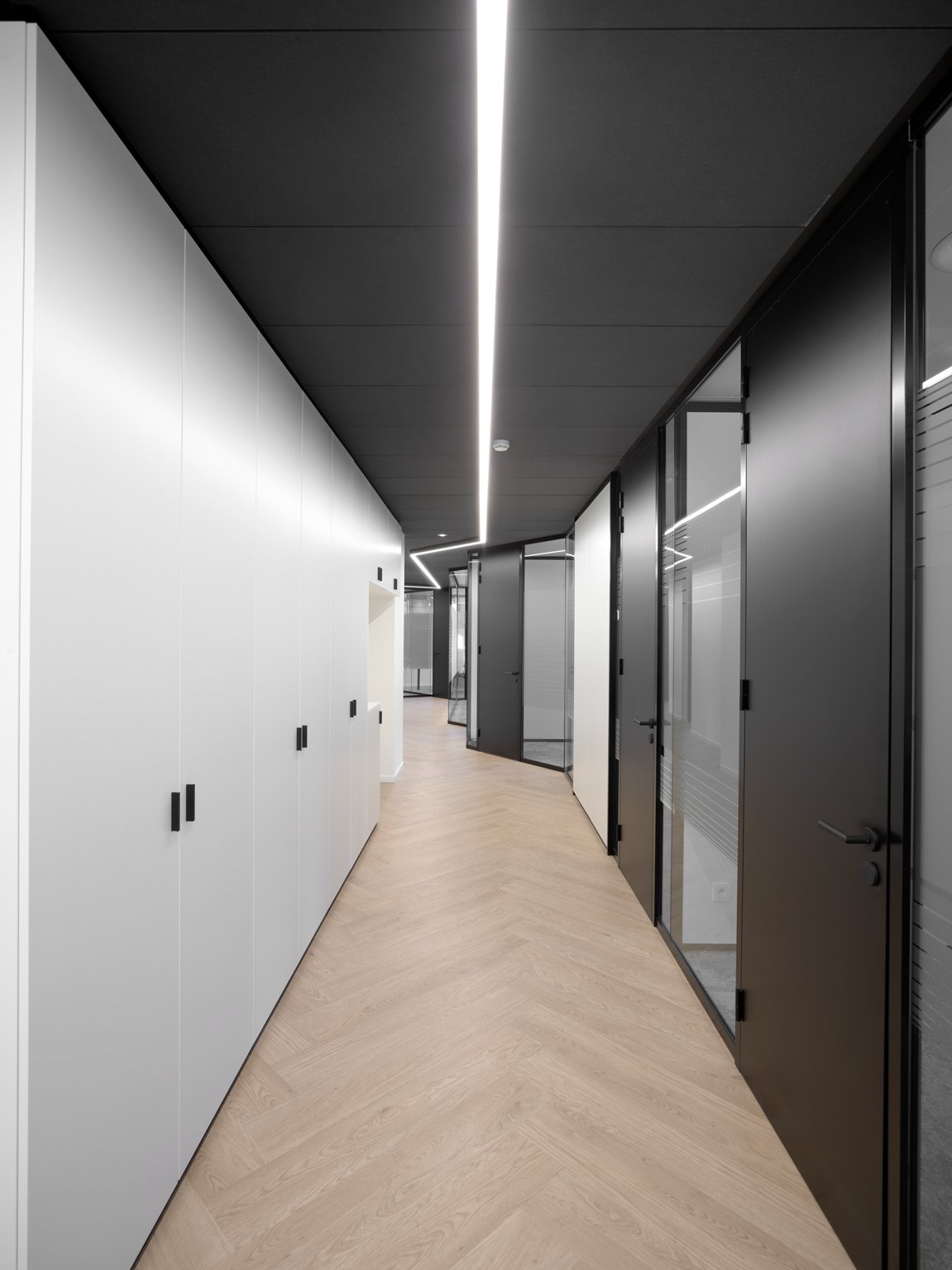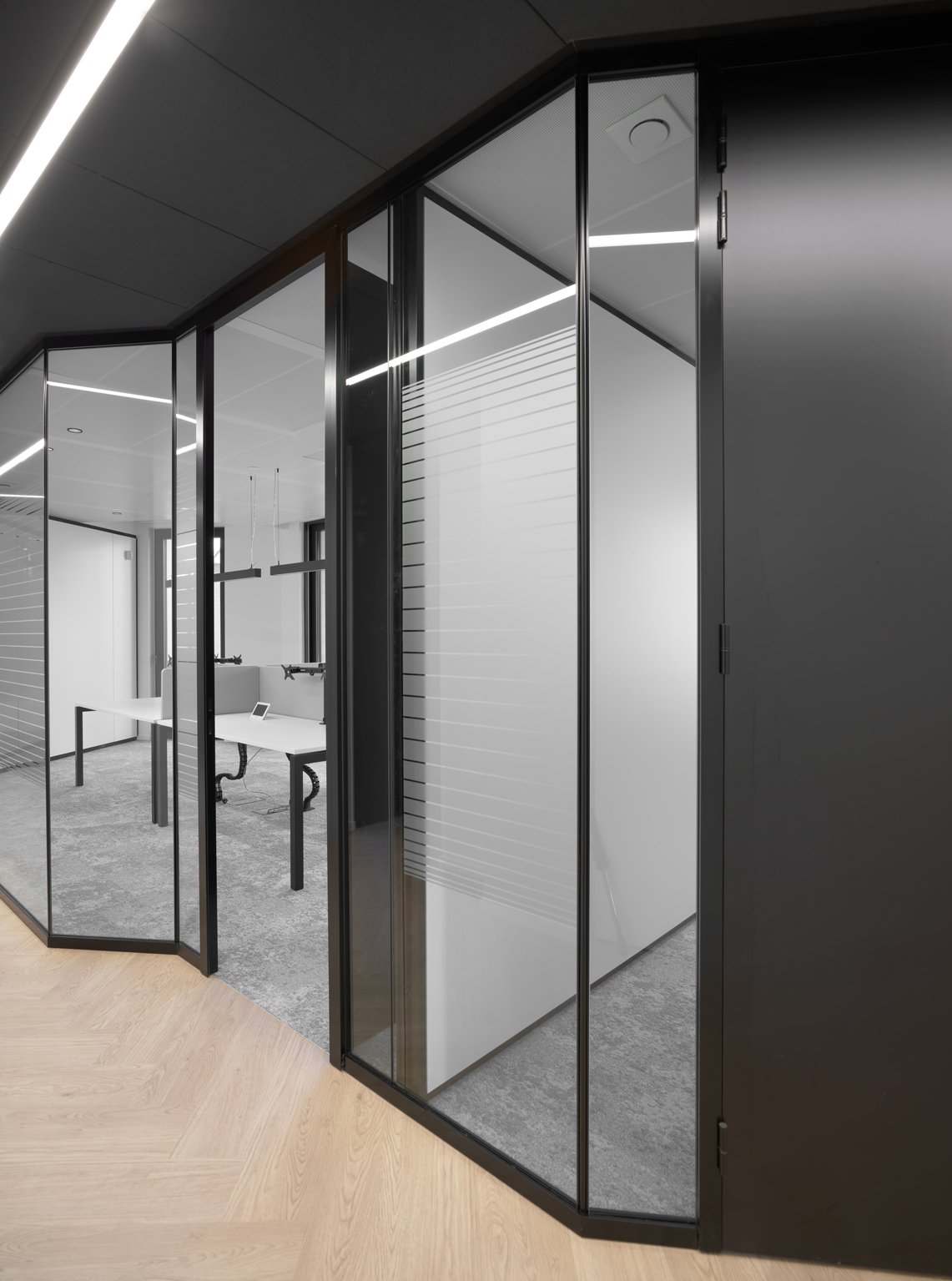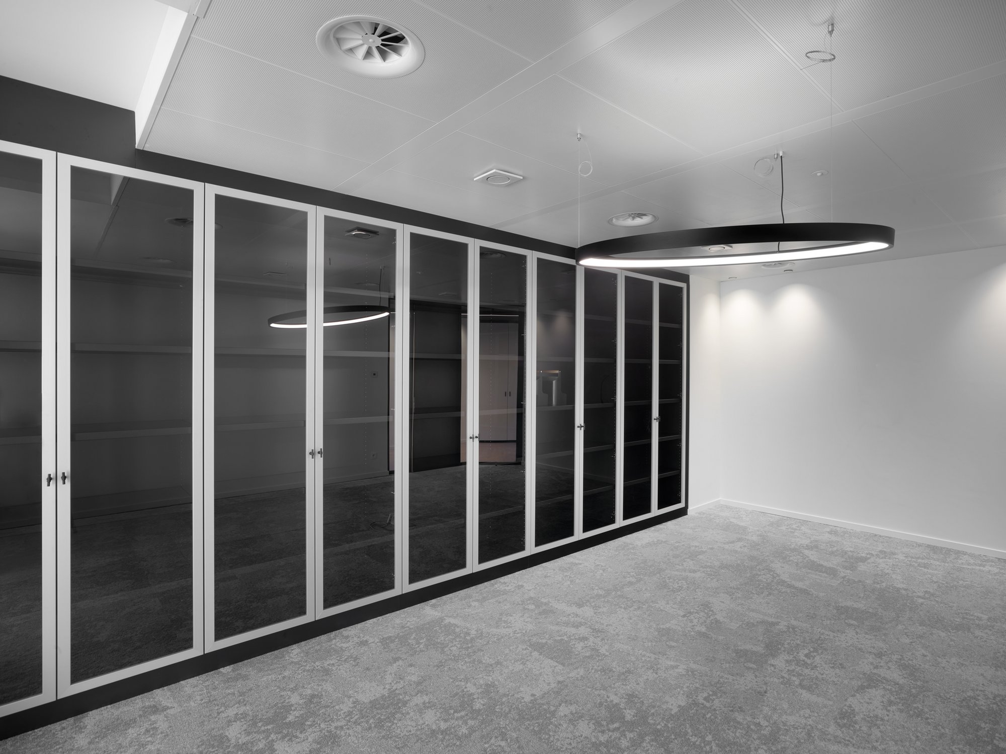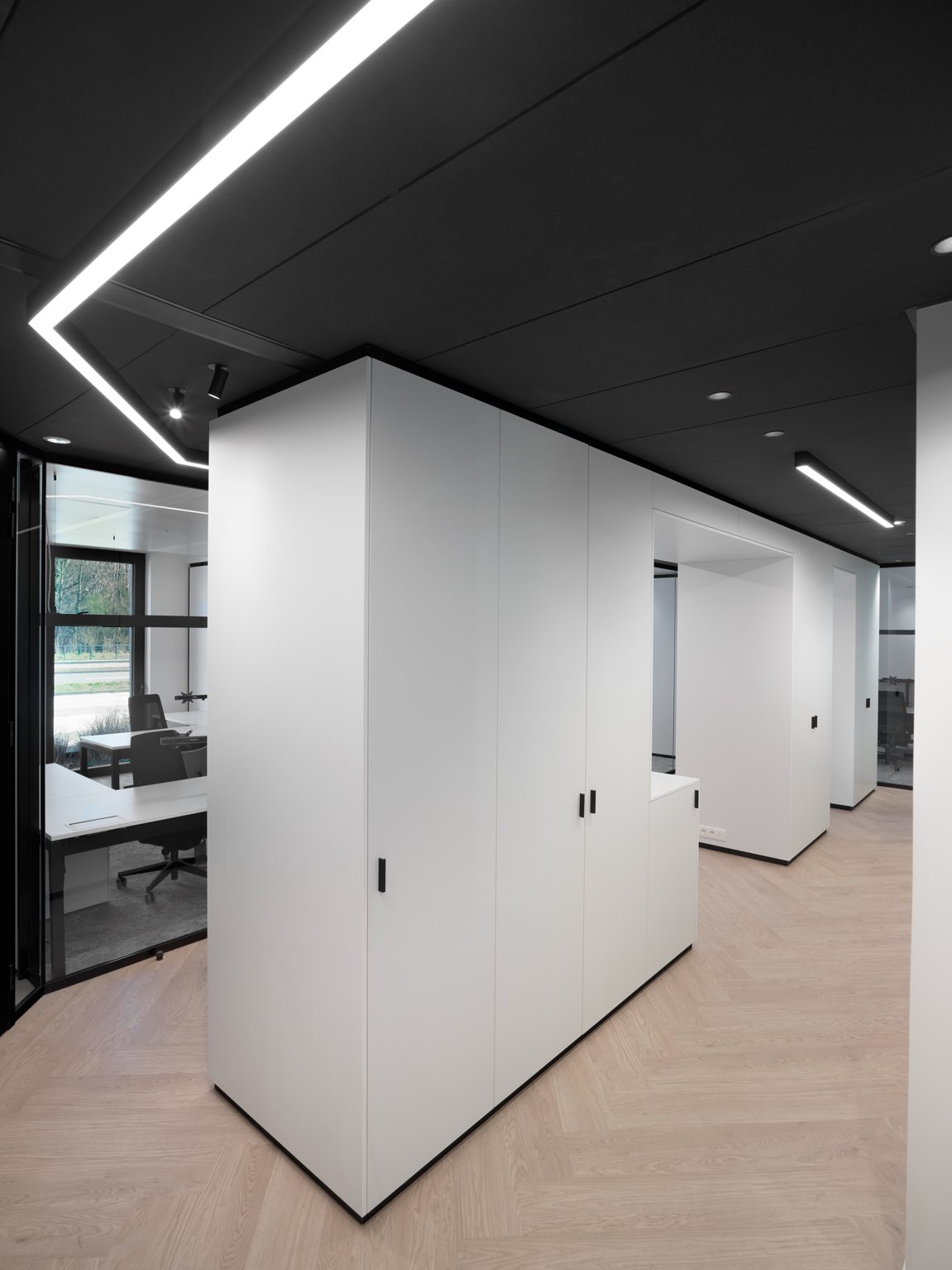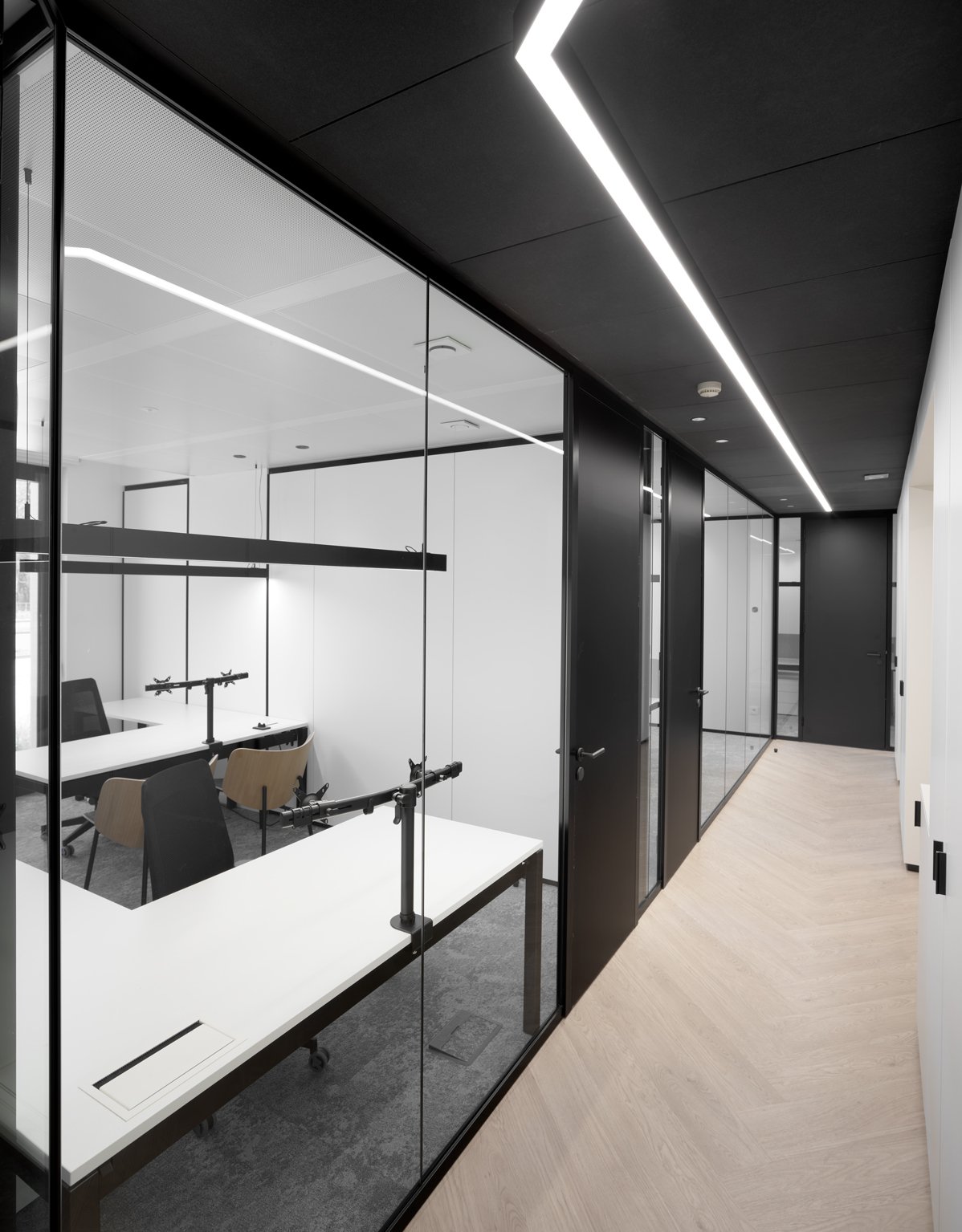 Outre la fourniture et l'installation de nos propres produits, tels que les cloisons pleines JB 2000, les cloisons vitées JB 4000 et les ensembles de portes JB DOOR, Beddeleem s'est également chargé de l'installation de tous les plafonds métalliques, des finitions de sol, de la peinture, du mobilier (sur mesure), de la réalisation de la cuisine et de l'électricité, l'éclairage, la climatisation et la plomberie.