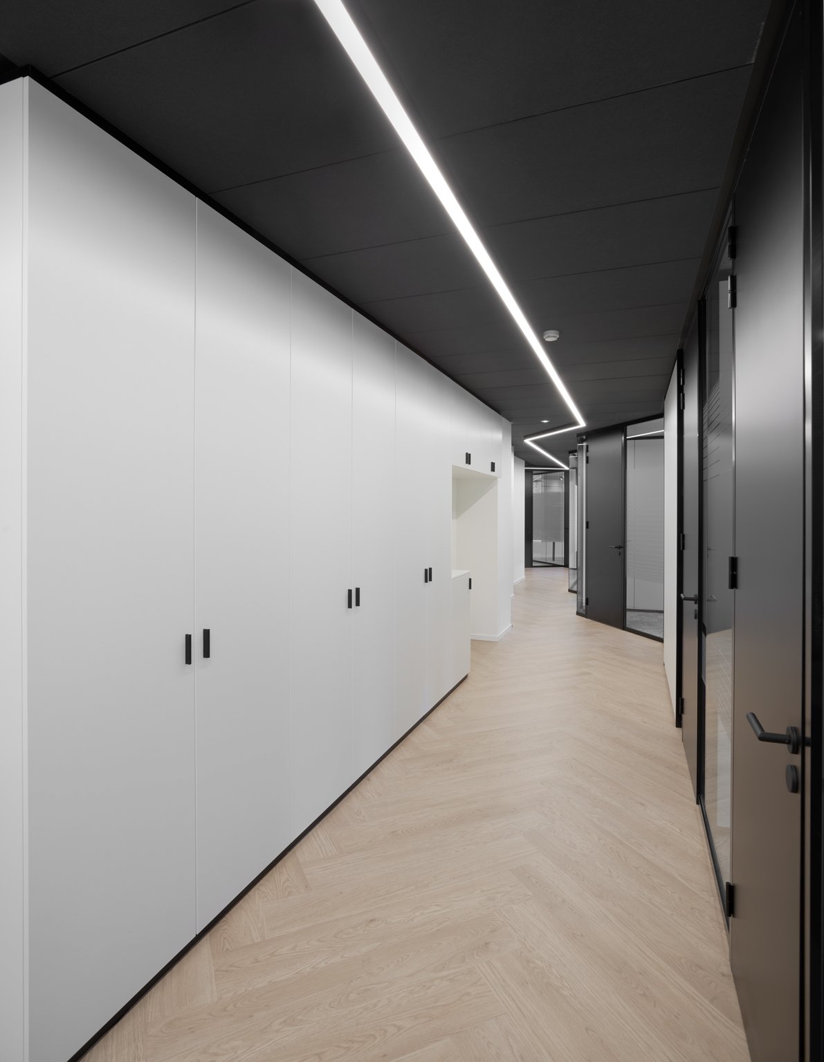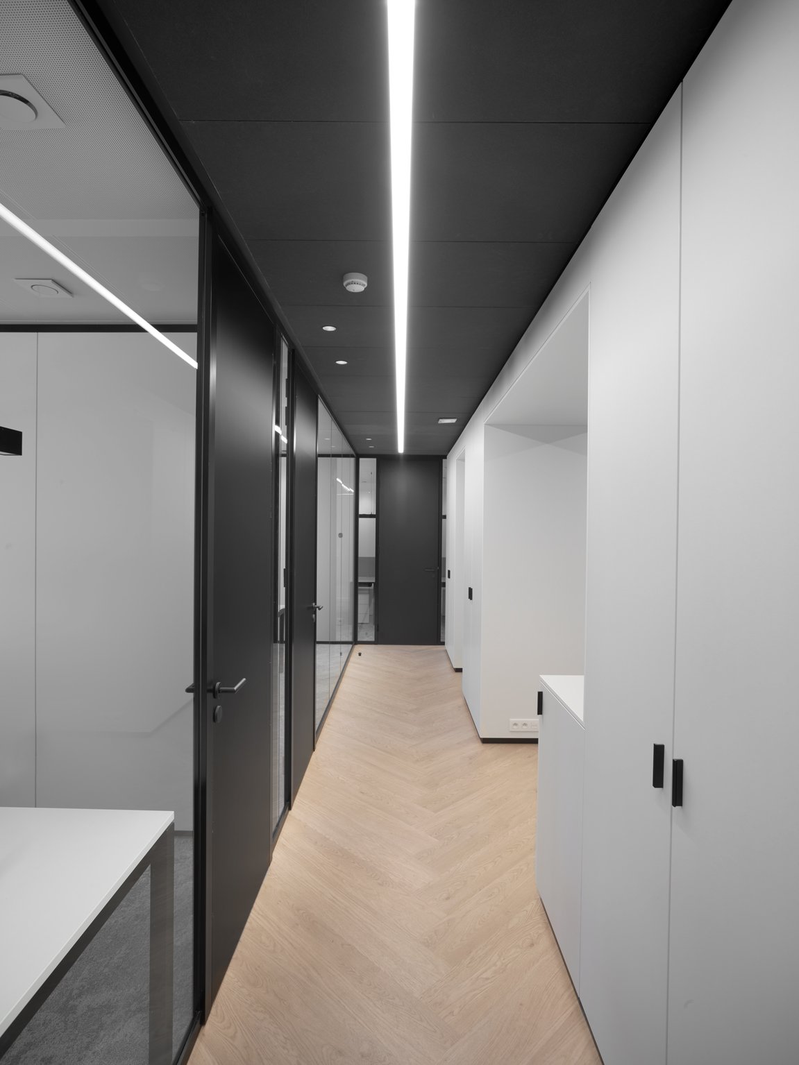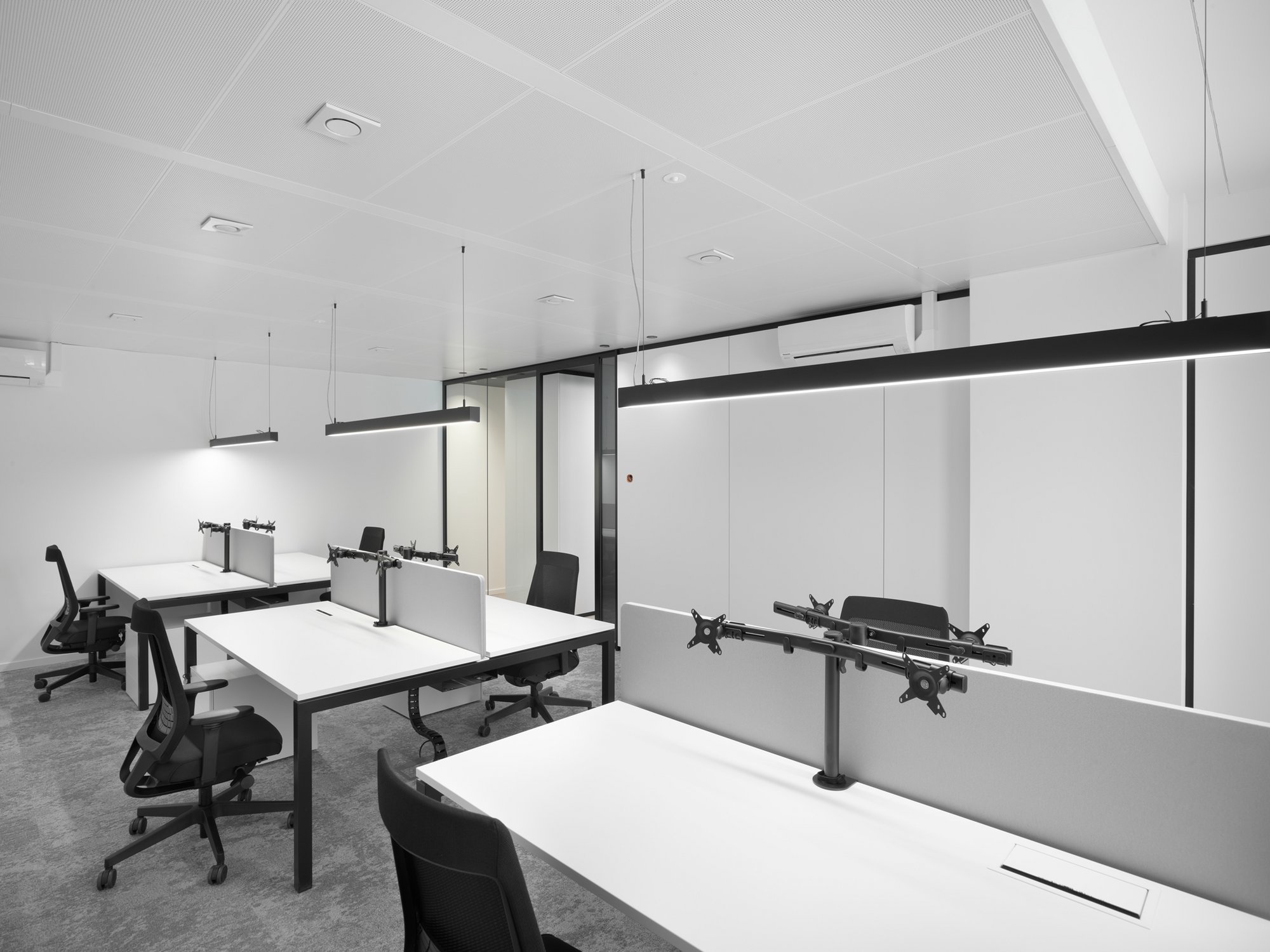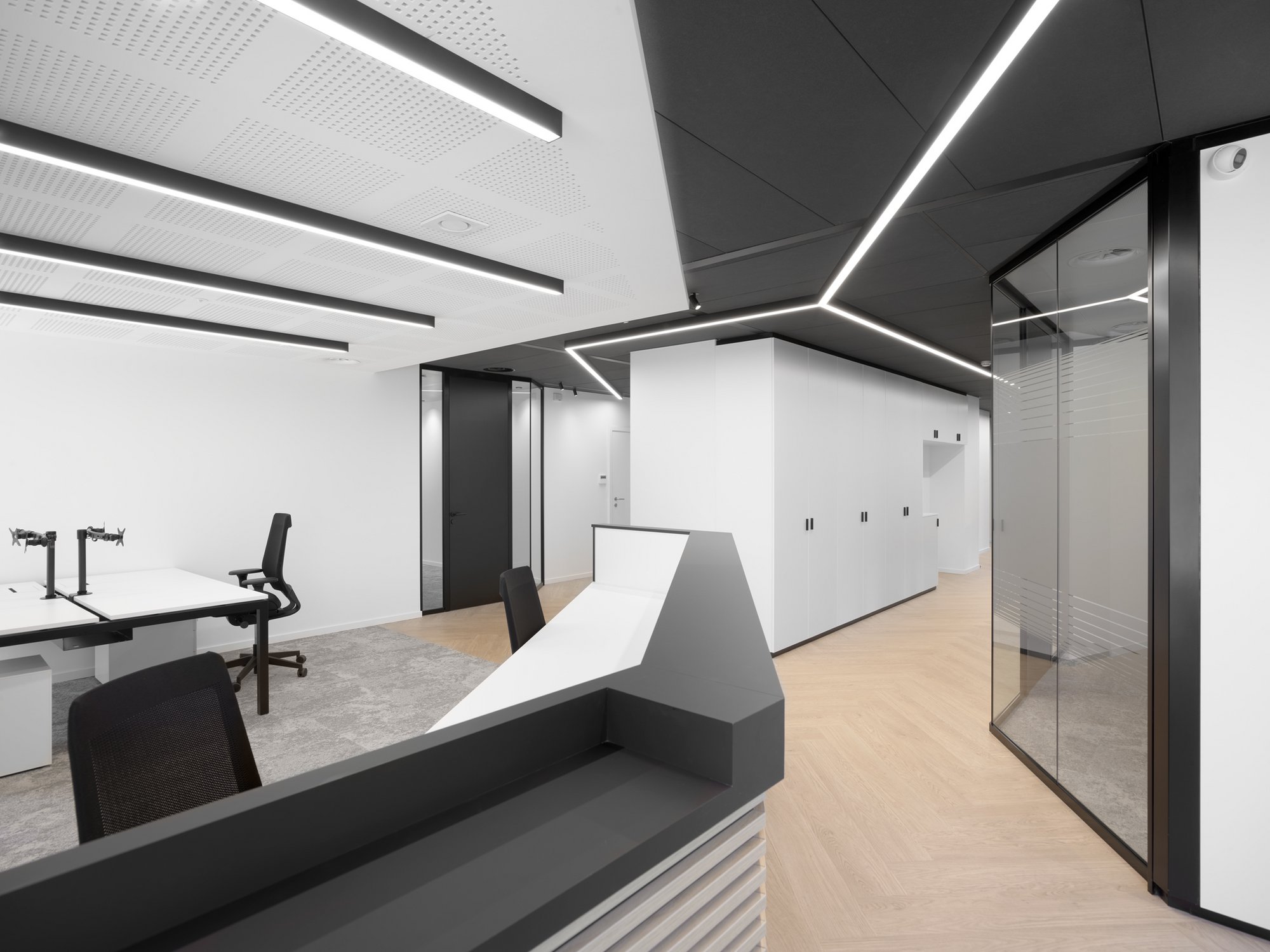 Outre la fourniture et l'installation de nos propres produits, tels que les cloisons pleines JB 2000, les cloisons vitées JB 4000 et les ensembles de portes JB DOOR, Beddeleem s'est également chargé de l'installation de tous les plafonds métalliques, des finitions de sol, de la peinture, du mobilier (sur mesure), de la réalisation de la cuisine et de l'électricité, l'éclairage, la climatisation et la plomberie.