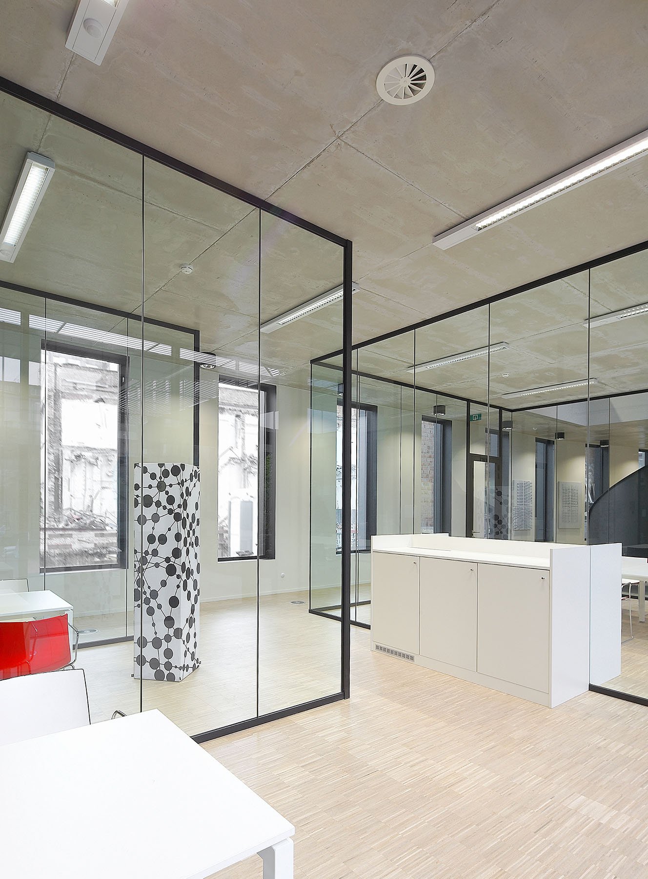 Het glassysteem is compatibel met vaste wanden door een specifiek hiervoor ontwikkeld koppelprofiel dat onzichtbaar kan worden ingegipst. De koppeling met ons volle wandsysteem JB 2000 gebeurt via een akoestisch verzorgde overgang met een minimale sectie.