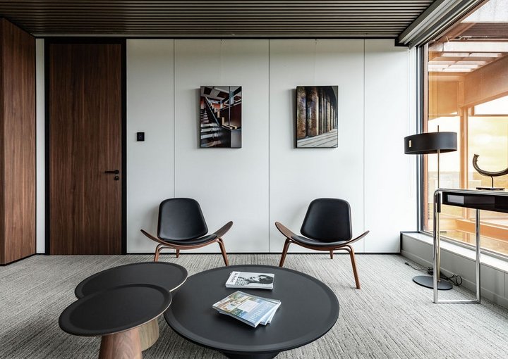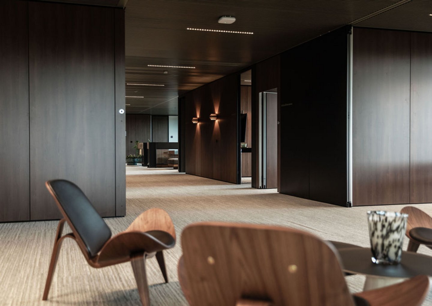 De profielen zitten verborgen achter het glas, waardoor een volledig glazen wandvlak ontstaat.