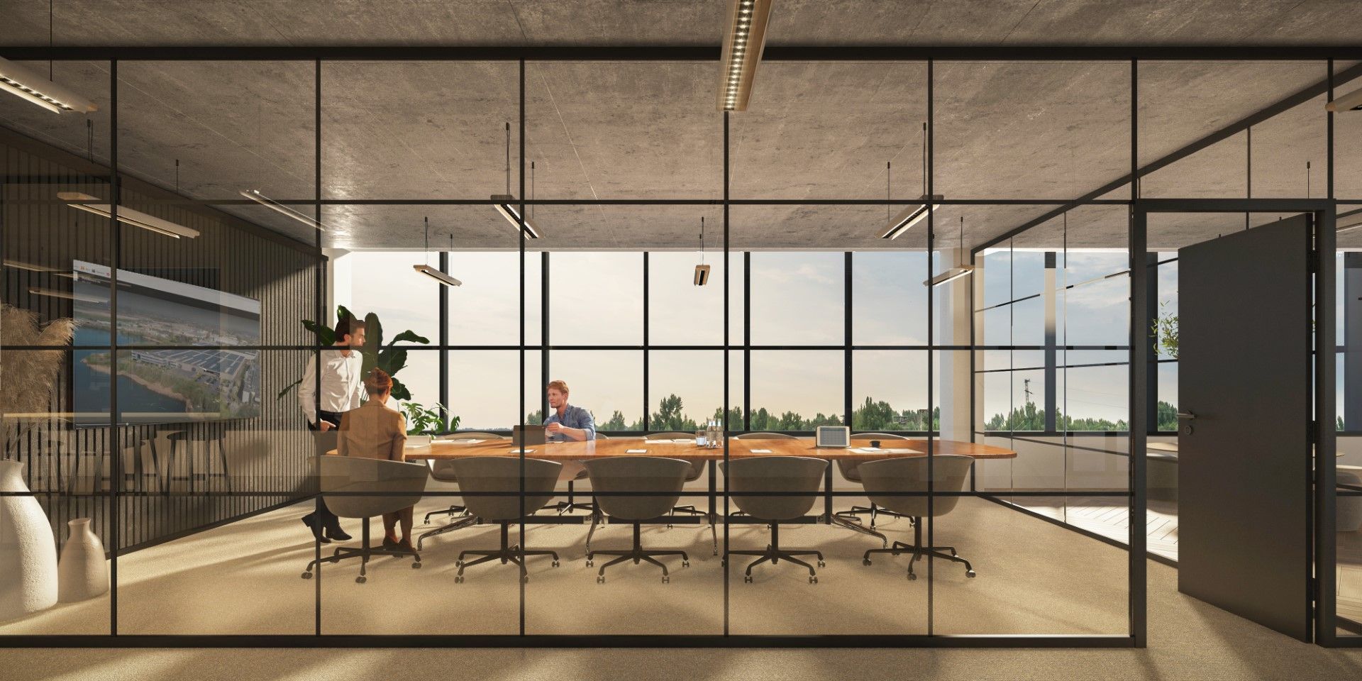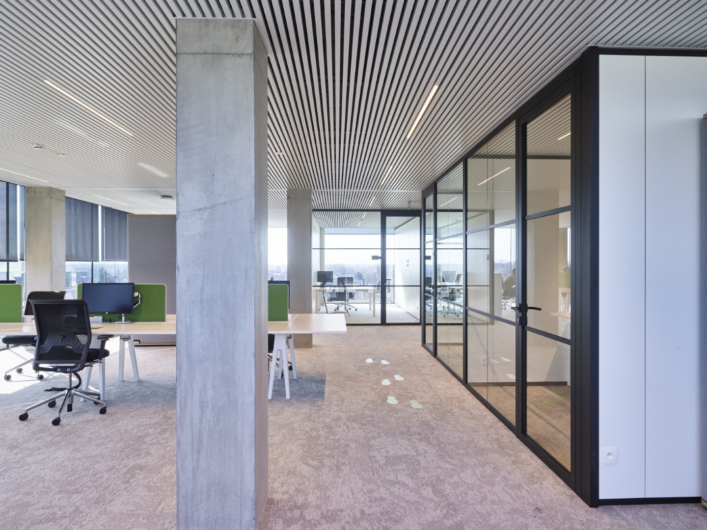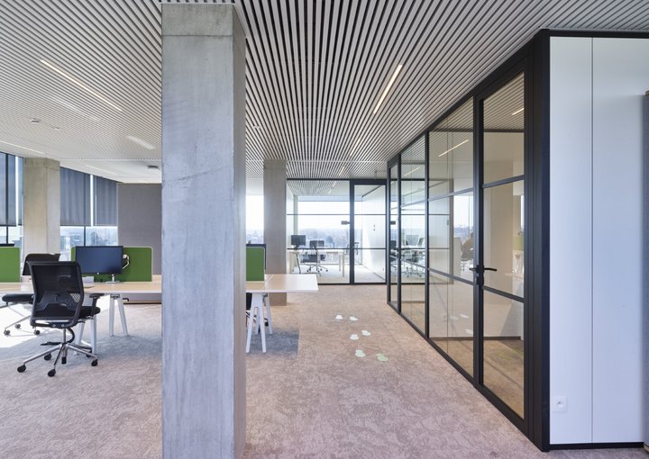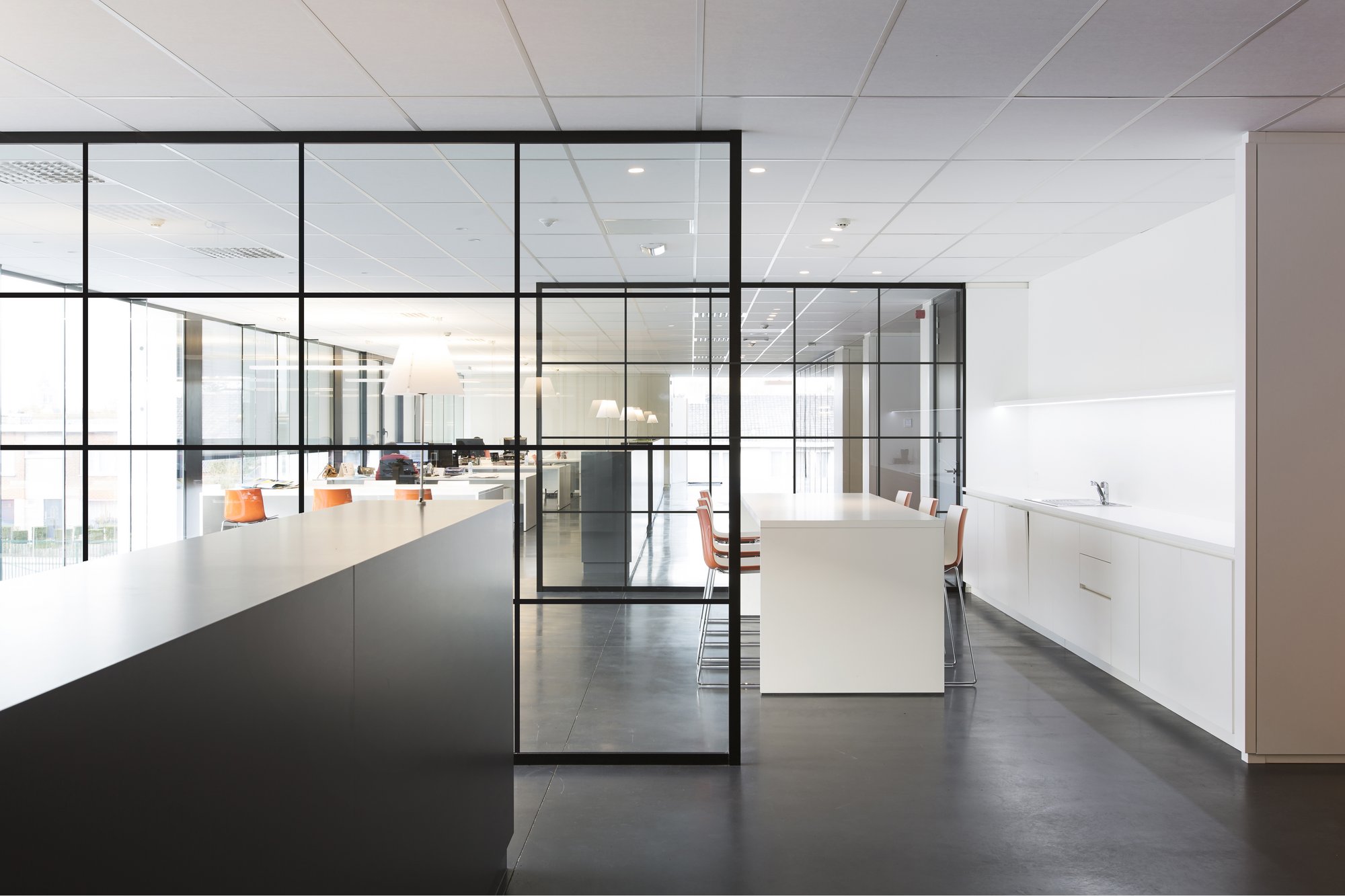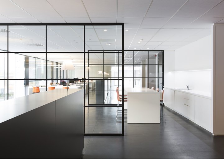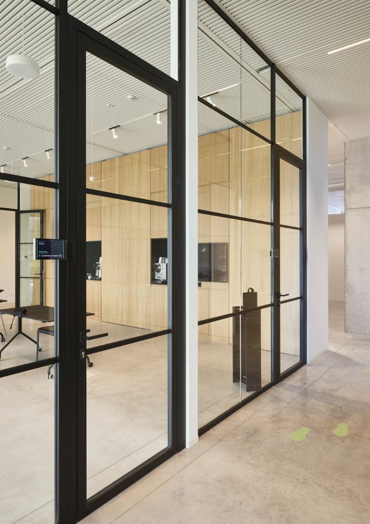 De glaspanelen worden onderverdeeld met extra profielen voor een strak, elegant en industrieel resultaat.