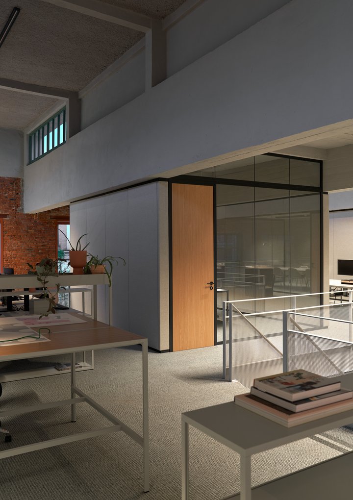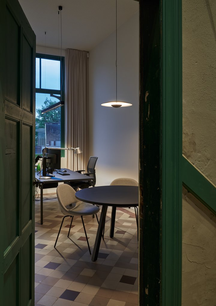 Met schuifdeuren die in de muren verdwijnen en een master-oak afwerking van de binnendeuren straalt dit kantoor rust, klasse en vakmanschap uit. Het is een eerbetoon aan het verleden met minutieuze aandacht voor detail.