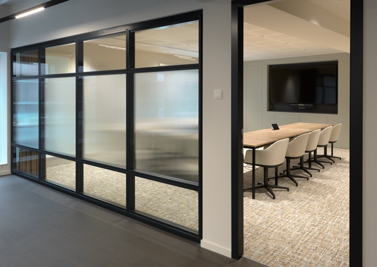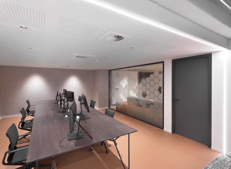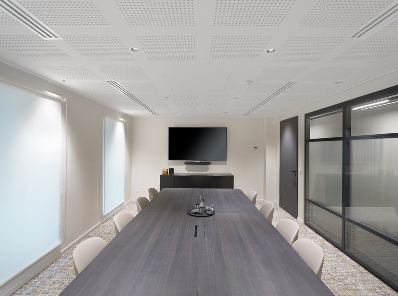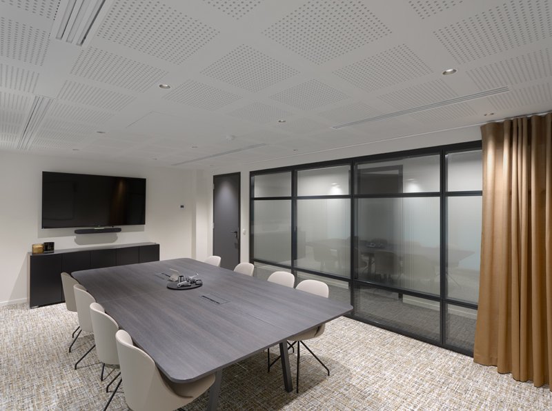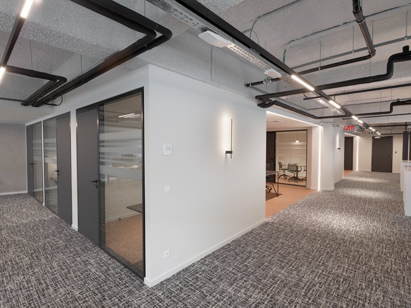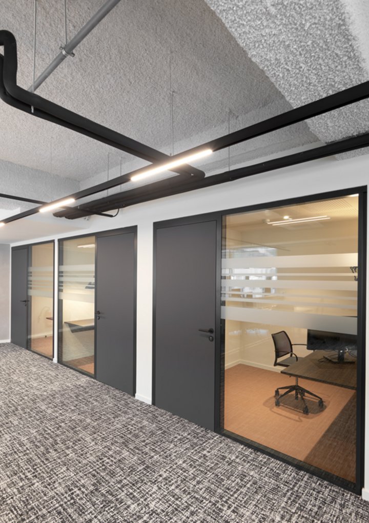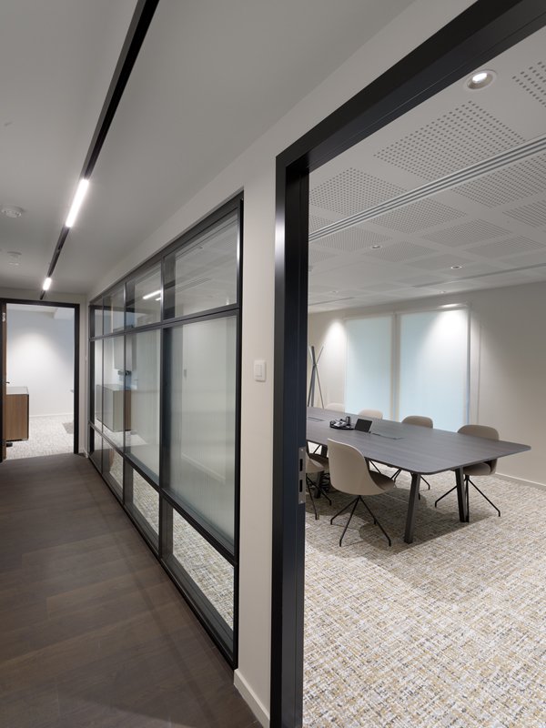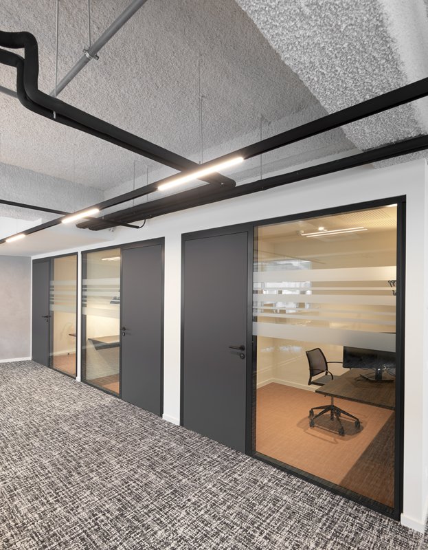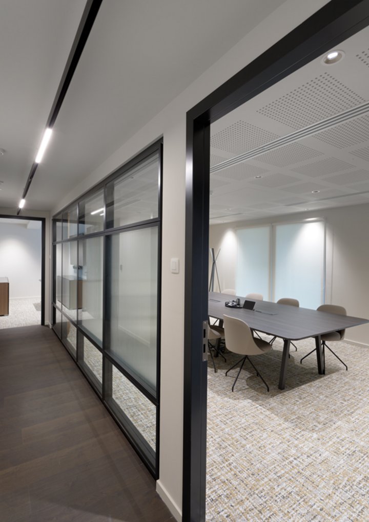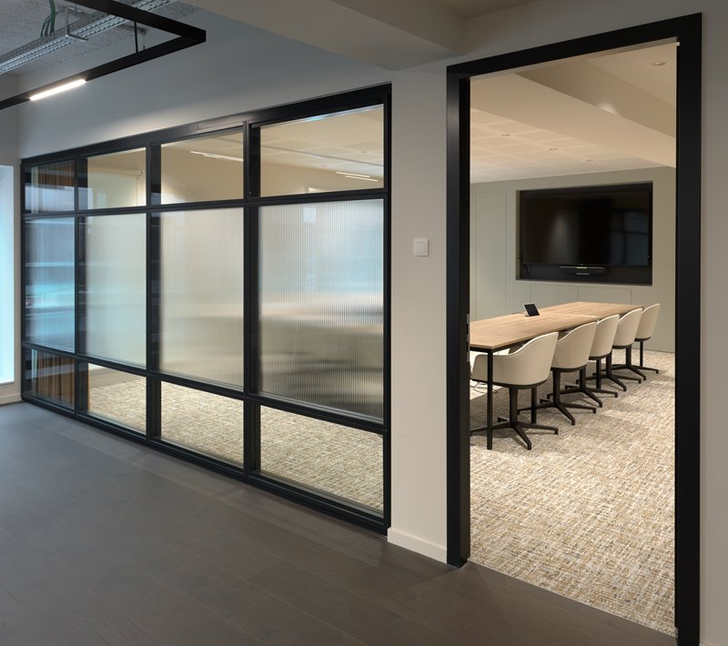 Naast de levering en plaatsing van onze eigen JB 2000 FRAME en JB PURE 100 beglaasde systeemwanden namen wij ook de plaatsing van de gipskartonwanden en -plafonds en de schilderwerken voor onze rekening.