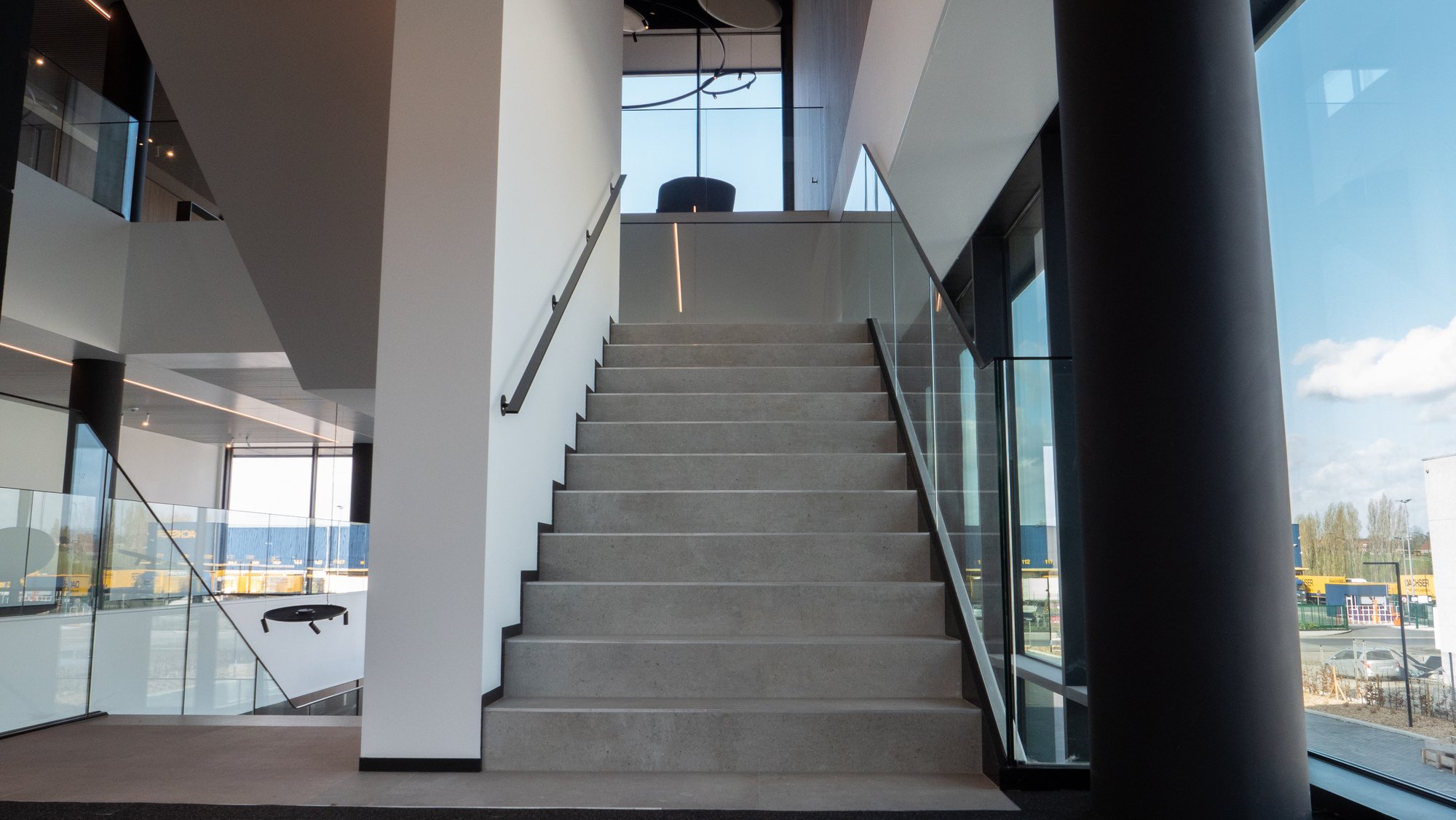 Verder werd de betonnen trap bekleed en afgewerkt met glasbalustrades, werd er chape geplaatst en bekleed met tapijt en tegelvloer.
