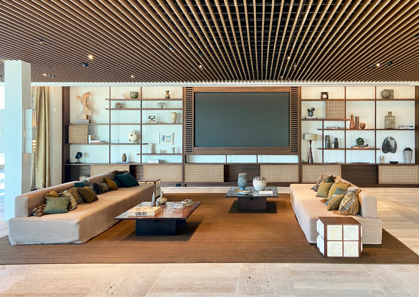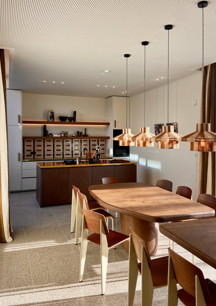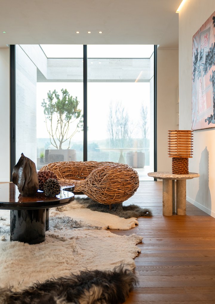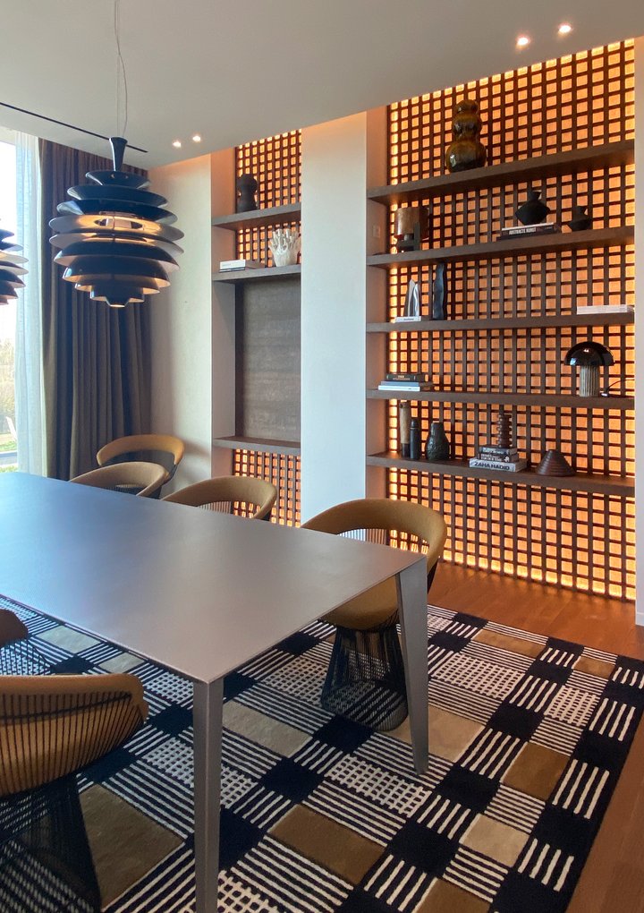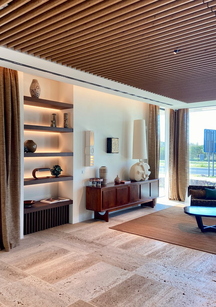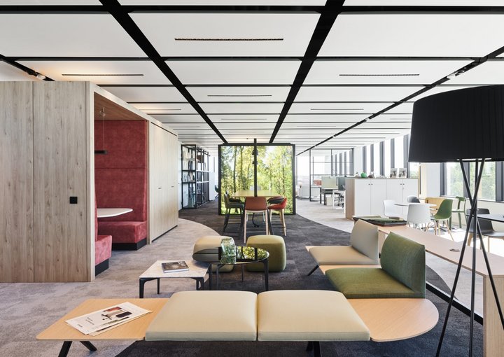 Een opvallend element in de open ruimte zijn de decoratieve houten lamellen op het plafond, geleverd en geplaatst door Beddeleem. Het warme karakter van het hout vormt een harmonieus geheel met het zorgvuldig uitgekozen meubilair, de kunstwerken en andere interieurdetails, wat bijdraagt aan een stijlvolle en uitnodigende werkomgeving.