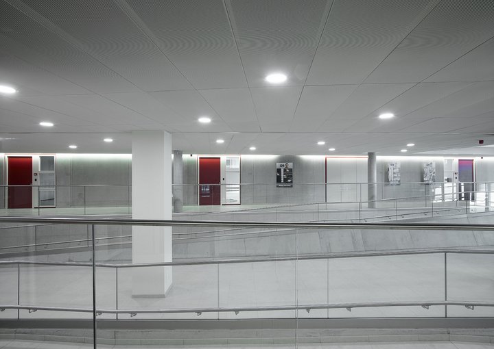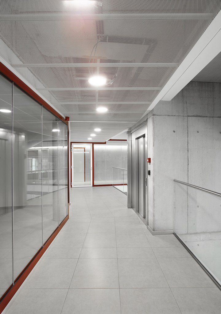 De metalen versie van de JB 2000-systeemwand wordt hier gecombineerd met het metalen JB CEILING-plafondsysteem voor een strakke uitstraling.