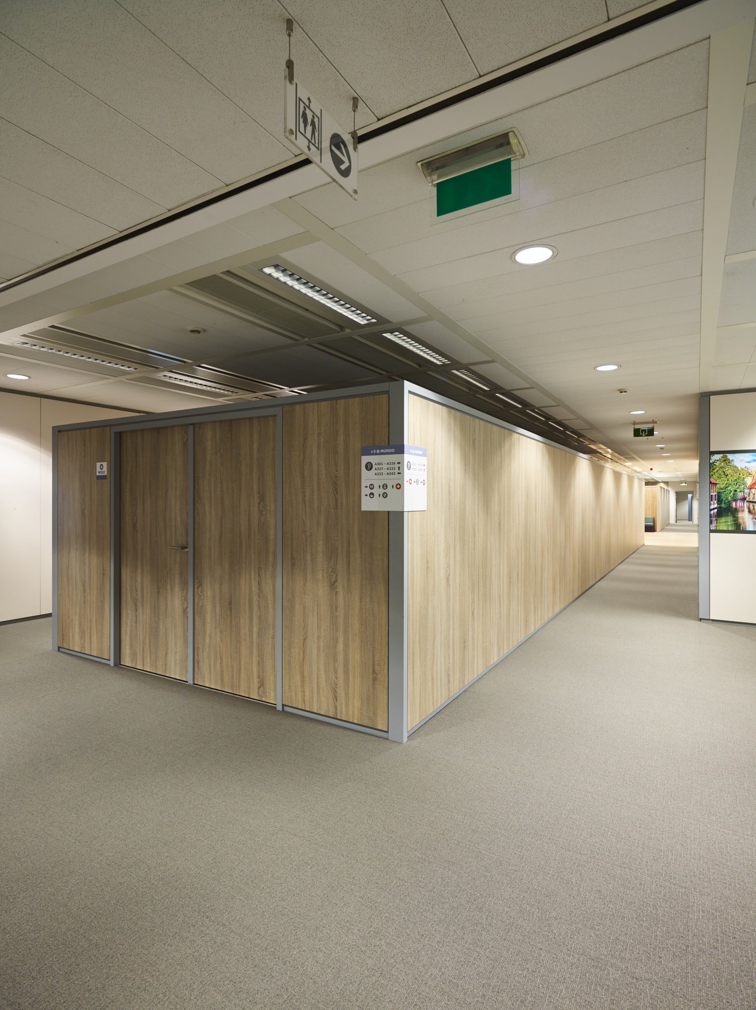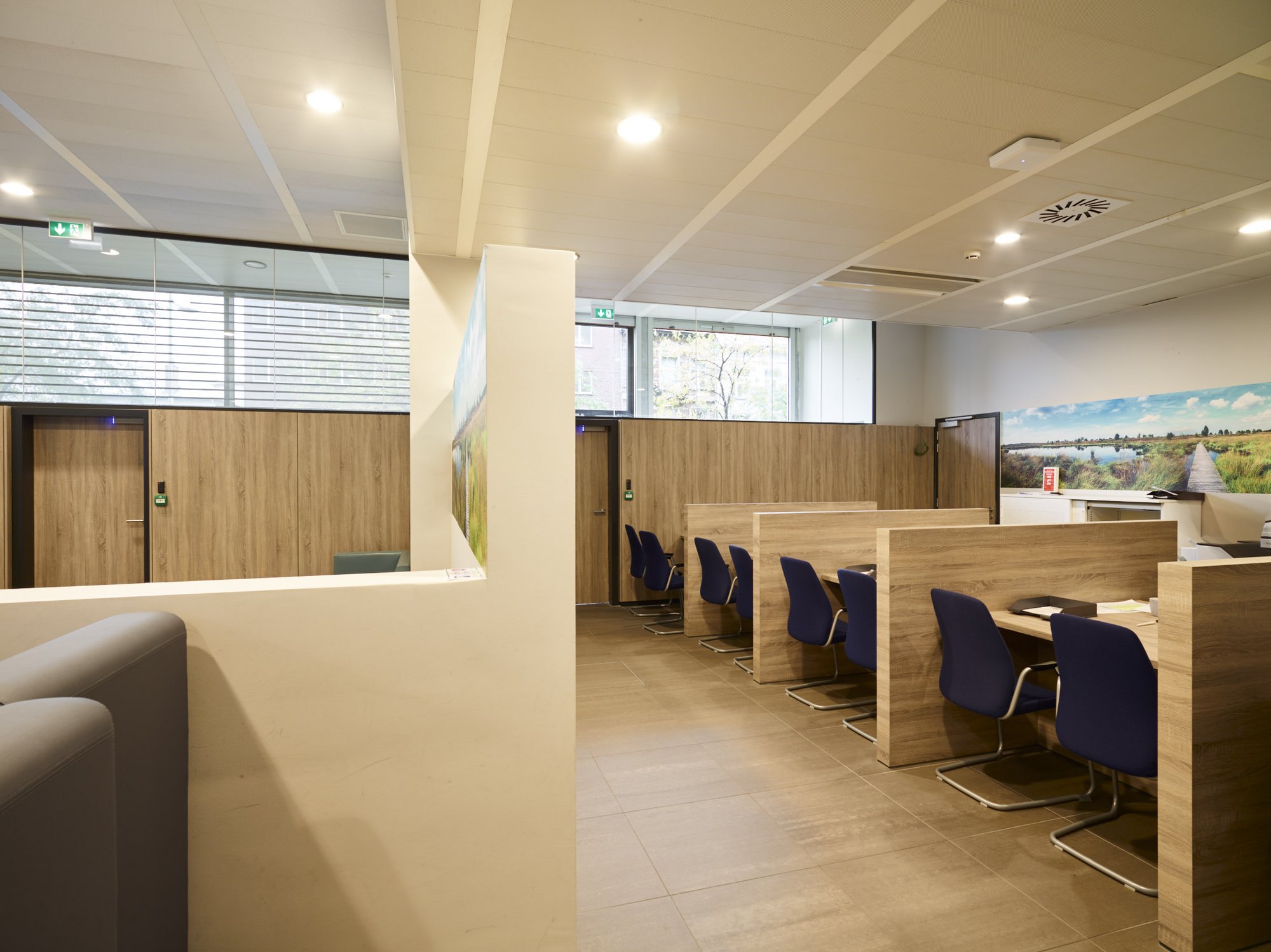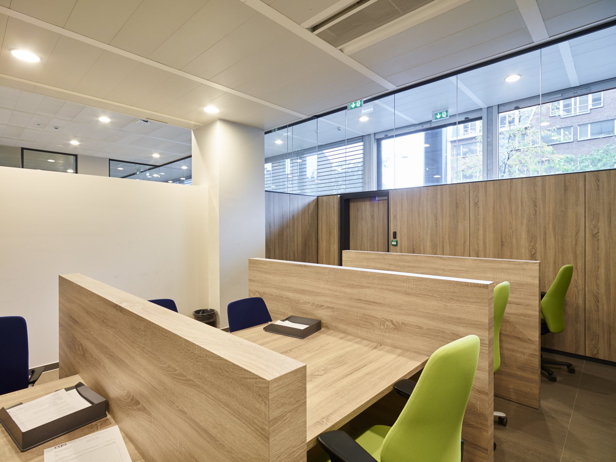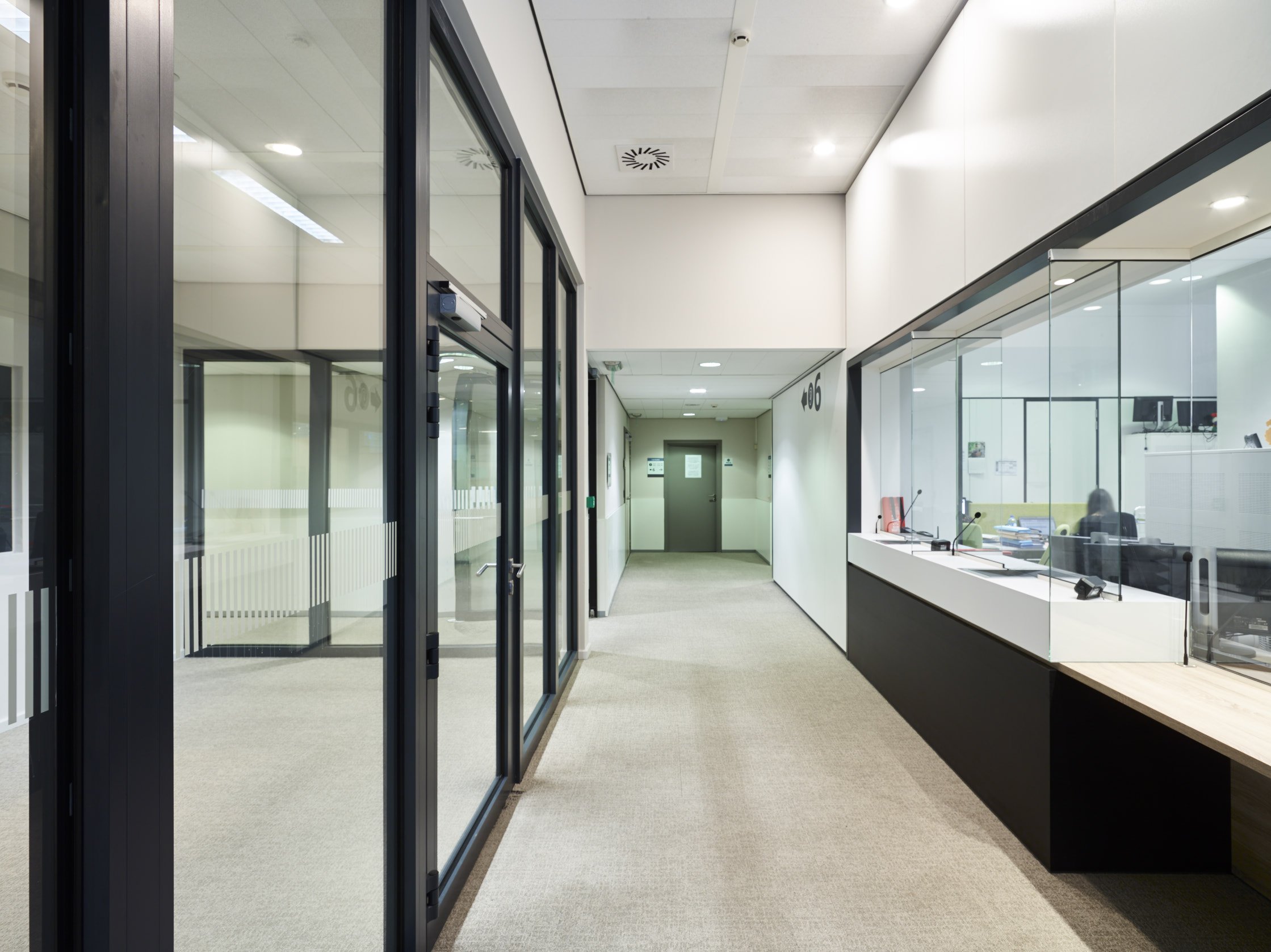 Totaalafwerking met verhoogde vloeren, zonwering, schilderwerken, vloerbekleding (tapijt en tegels), branddetectie, toegangscontrole, elektriciteit, databekabeling, HVAC, sanitair,