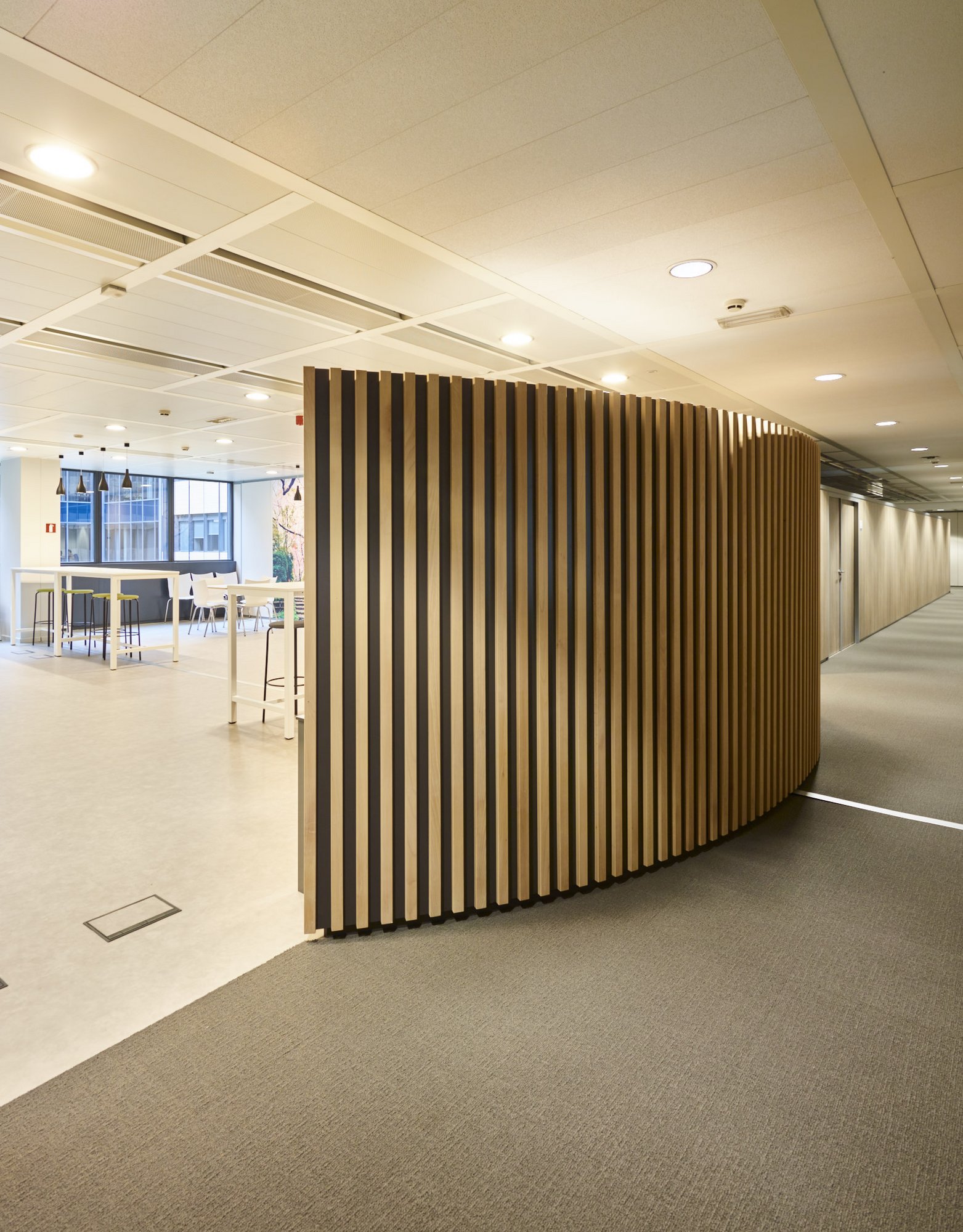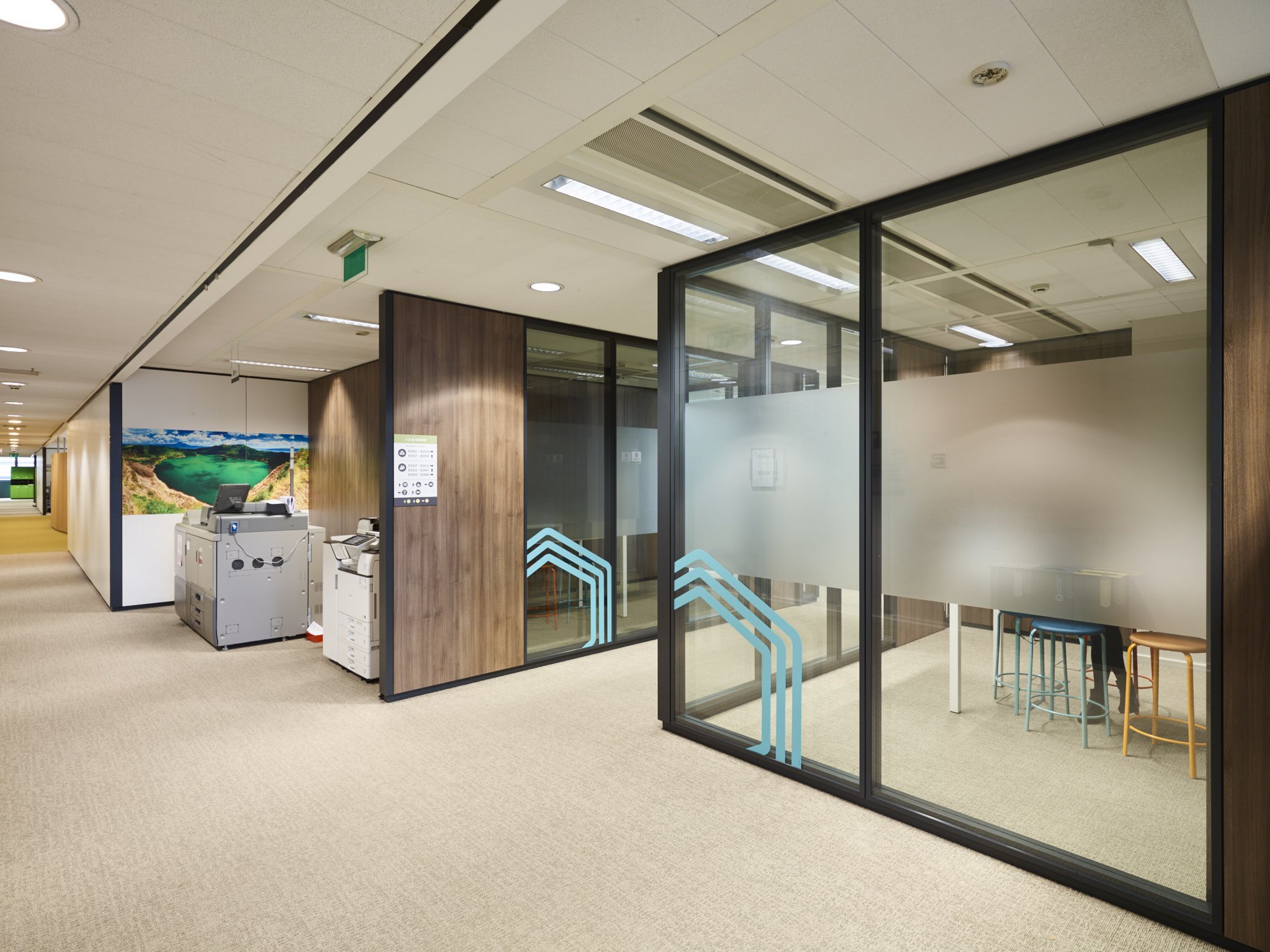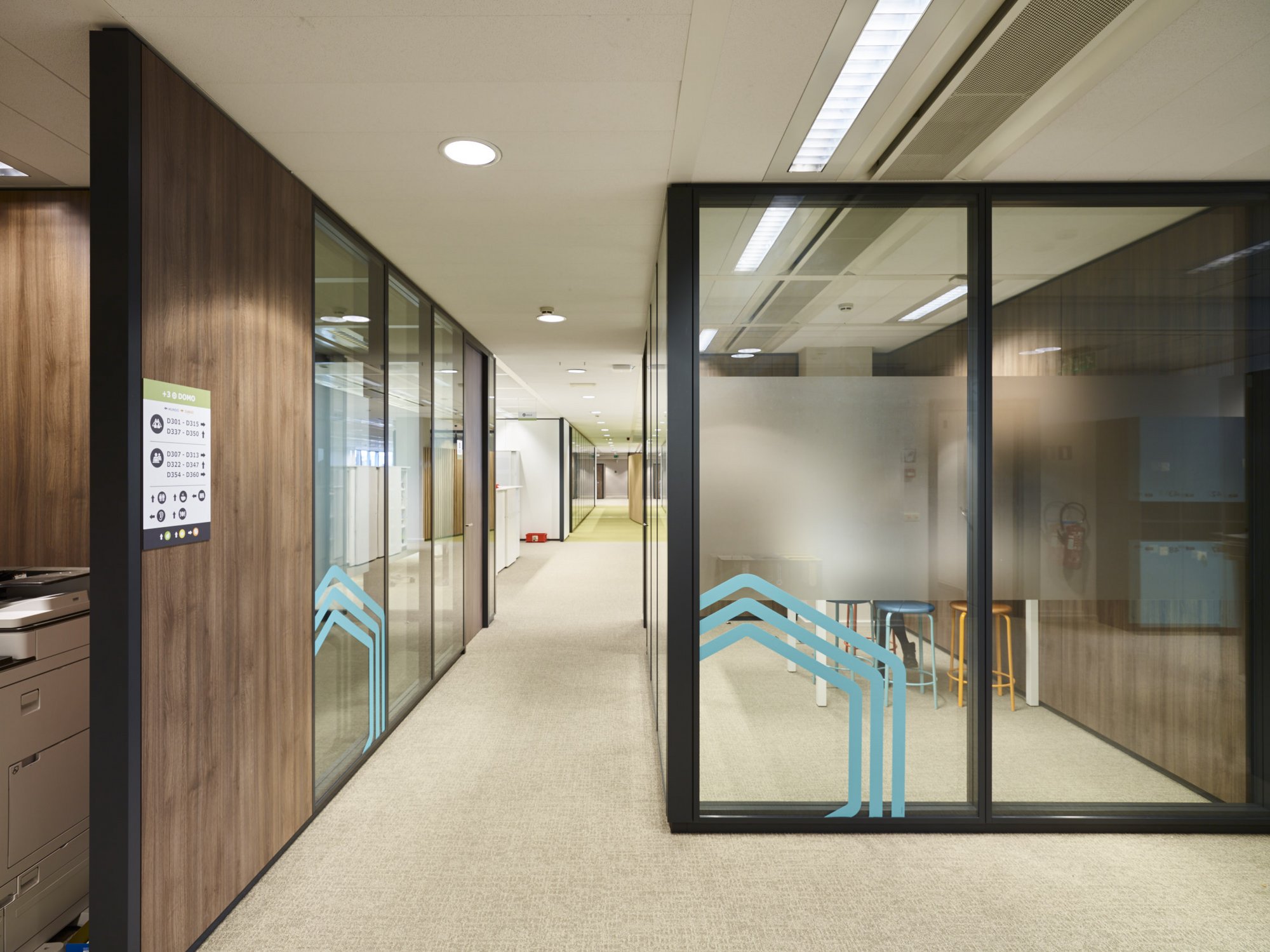 Totaalafwerking met verhoogde vloeren, zonwering, schilderwerken, vloerbekleding (tapijt en tegels), branddetectie, toegangscontrole, elektriciteit, databekabeling, HVAC, sanitair,