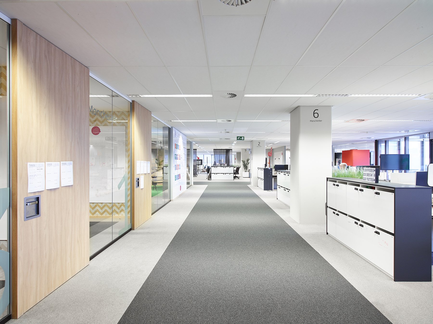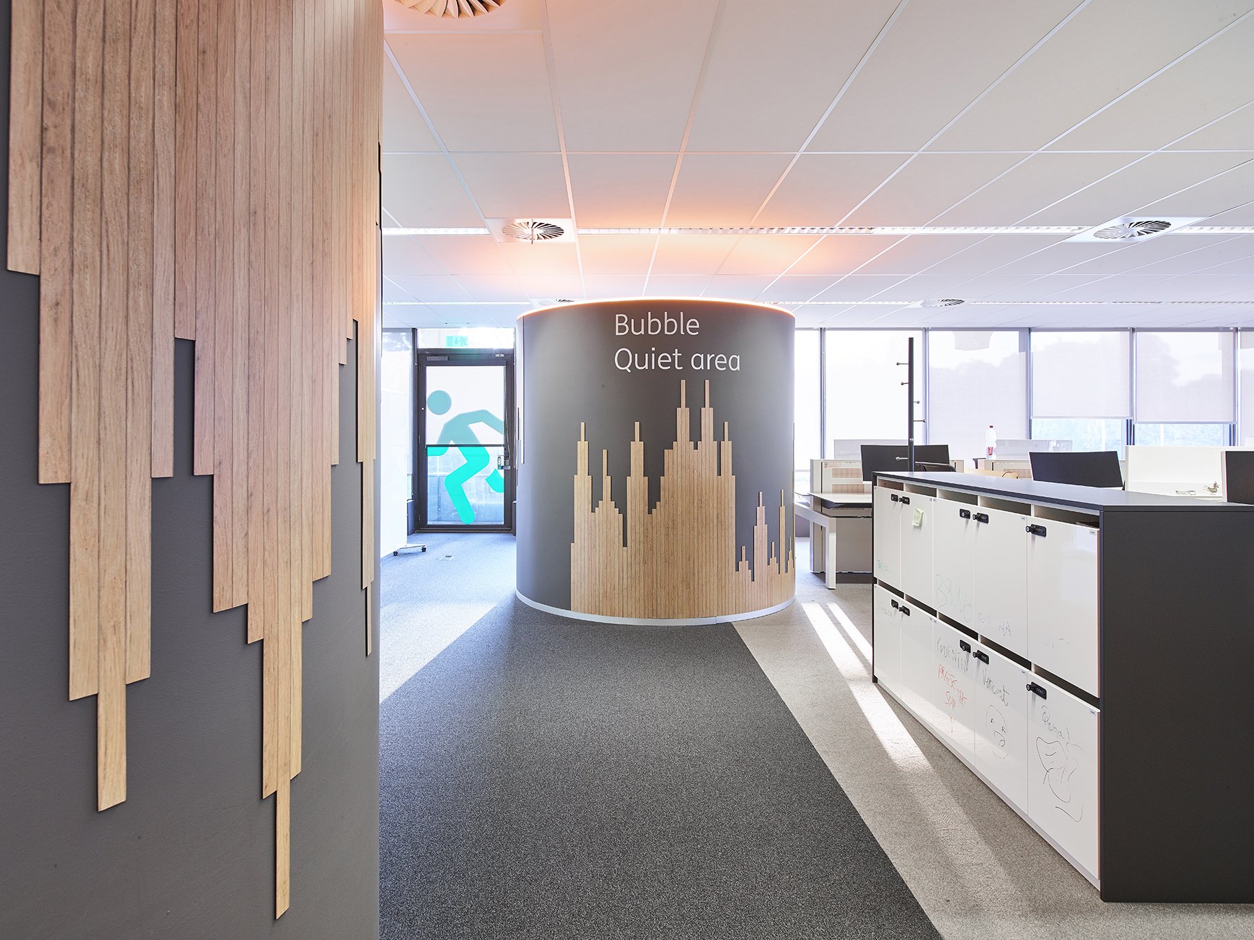 Voor het afbakenen van zones of het maken van kantoren wordt er gespeeld met de houten systeemwand JB 2000, de enkel beglaasde systeemwand JB 4000, gipskartonwanden en gordijnen.