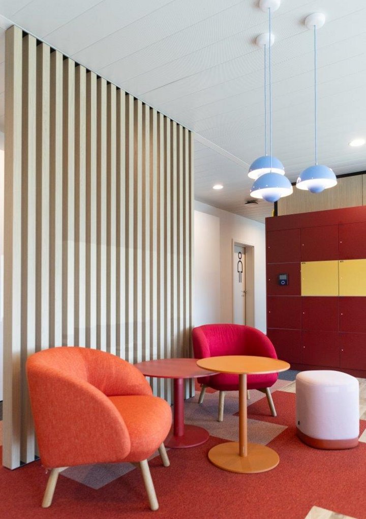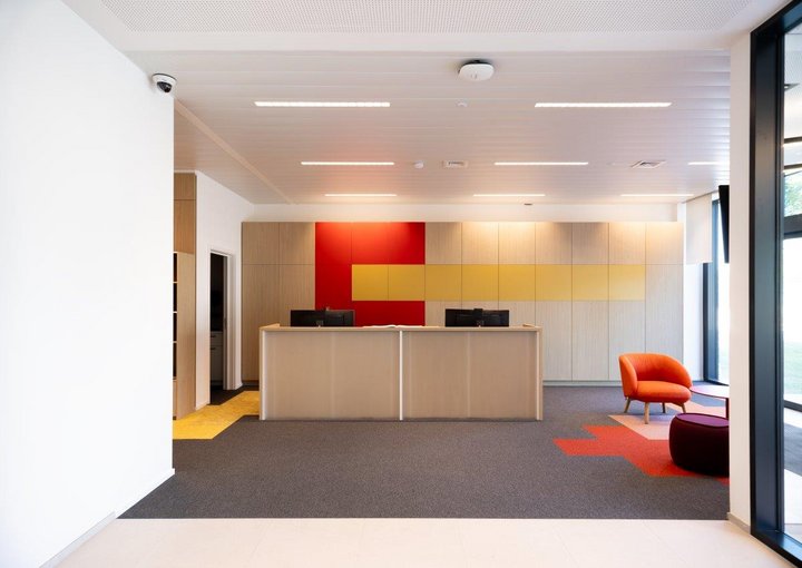 Deze integrale aanpak garandeerde hoogwaardige afwerkingen, functionele flexibiliteit en een consistente esthetiek doorheen het volledige gebouw.