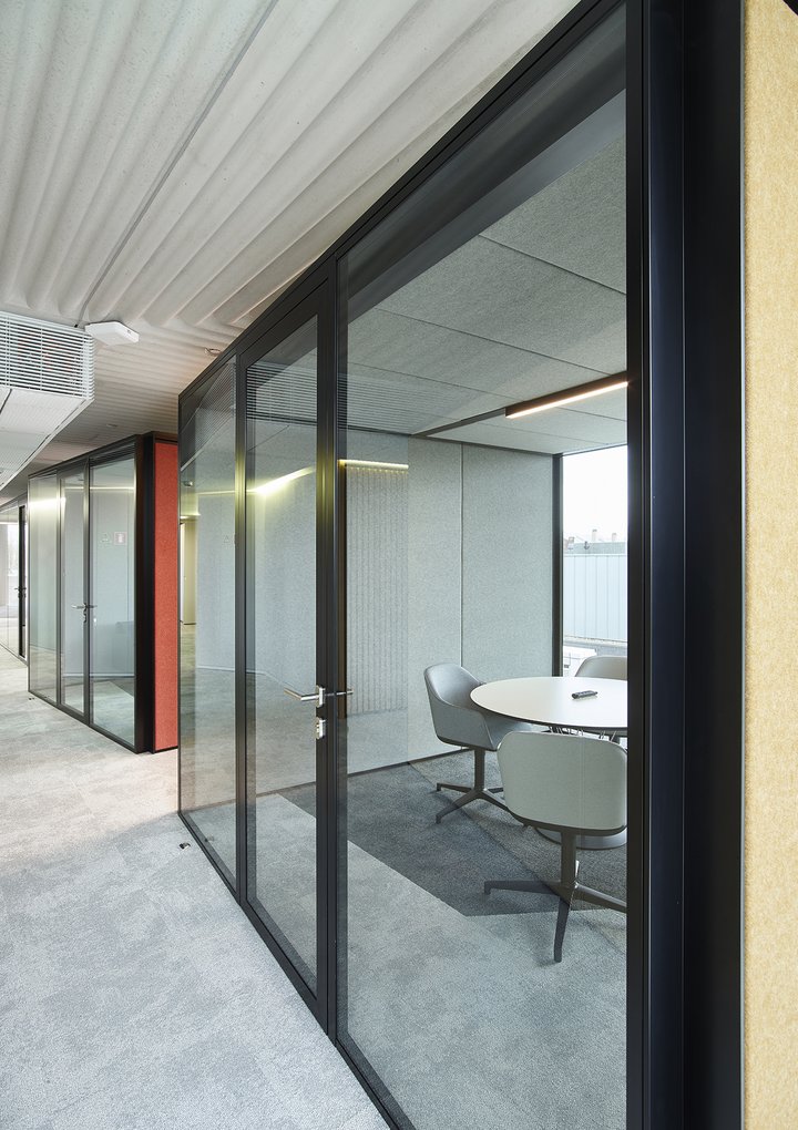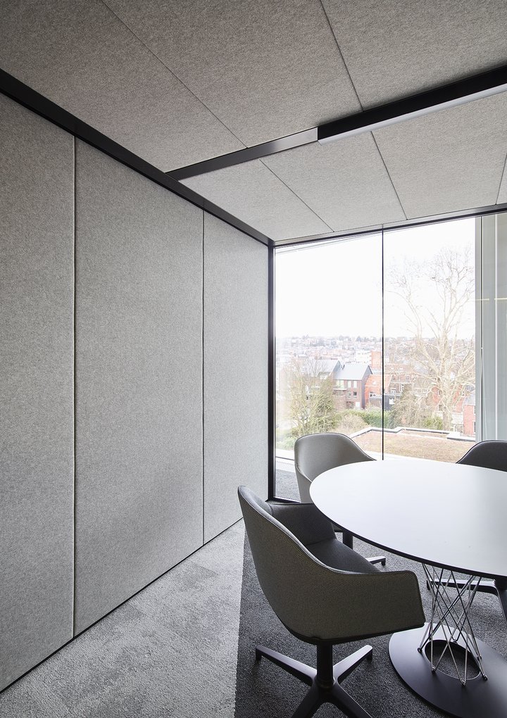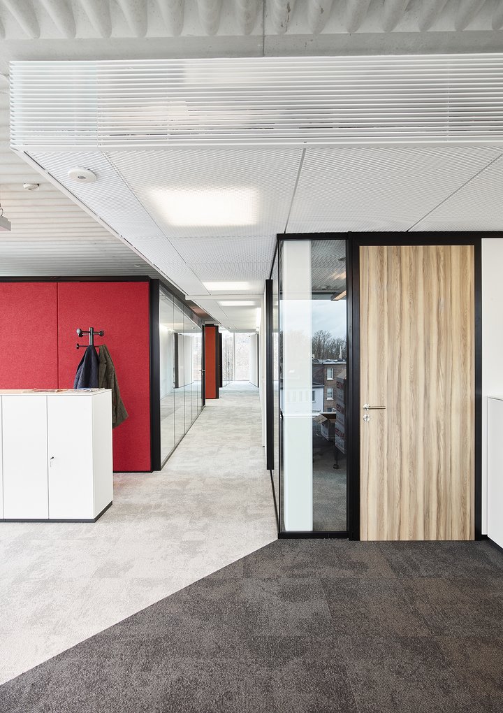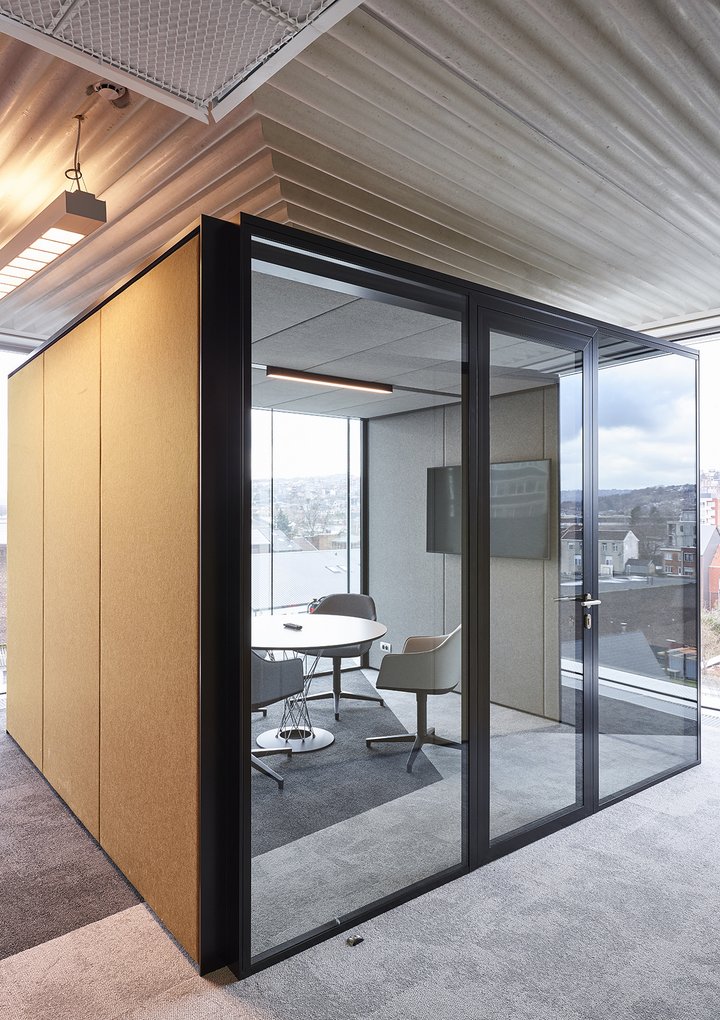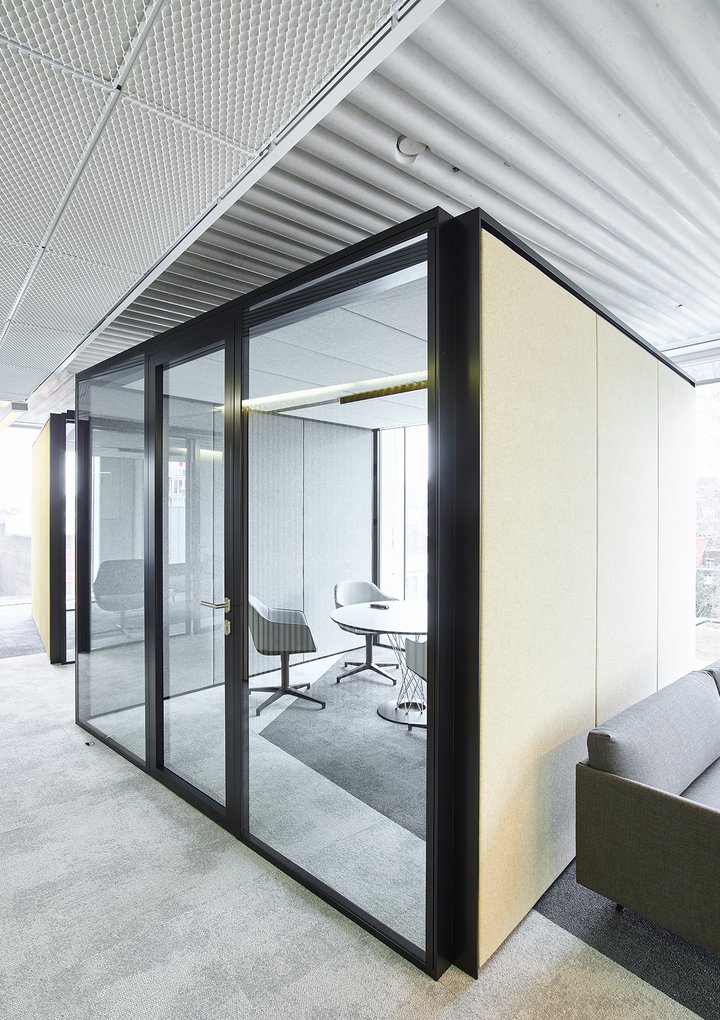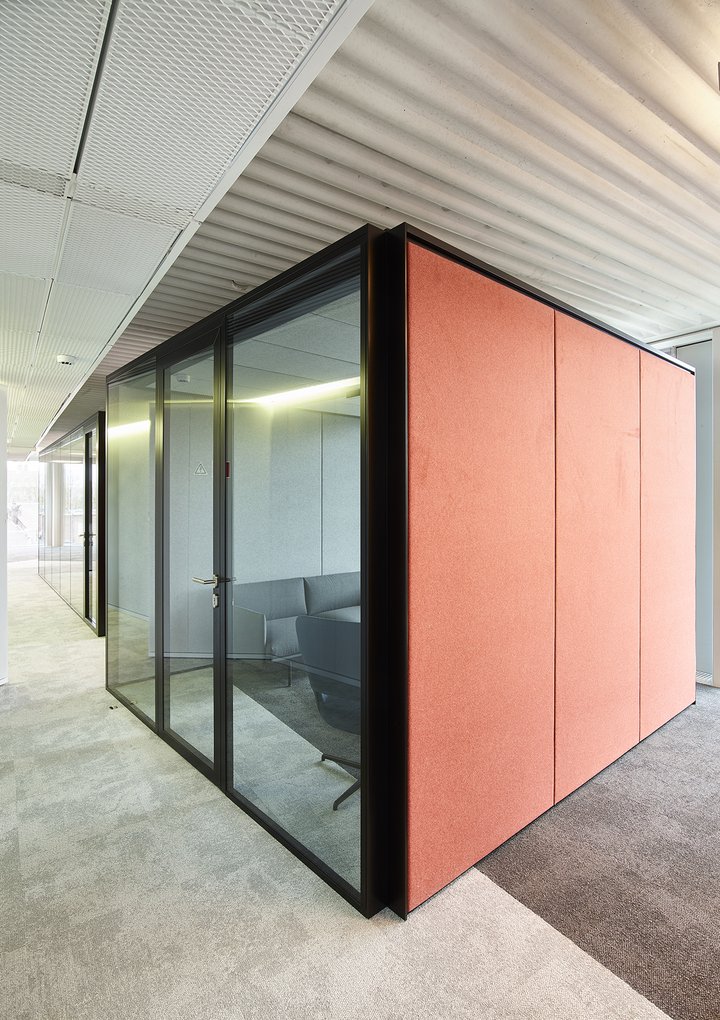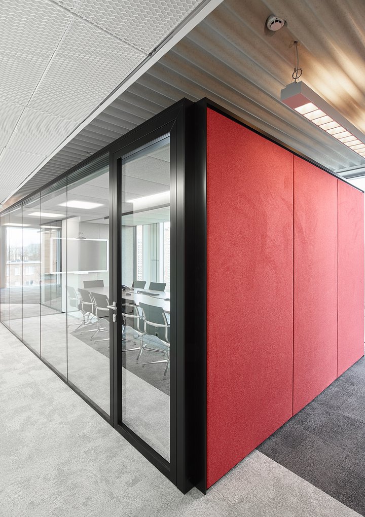 Het nieuwe werken in de JB QBE met een combinatie van de enkele glaswand JB PURE 50 en de gestoffeerde volle wand JB 2000.