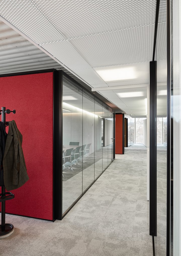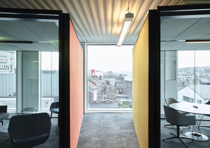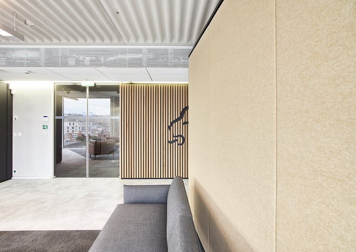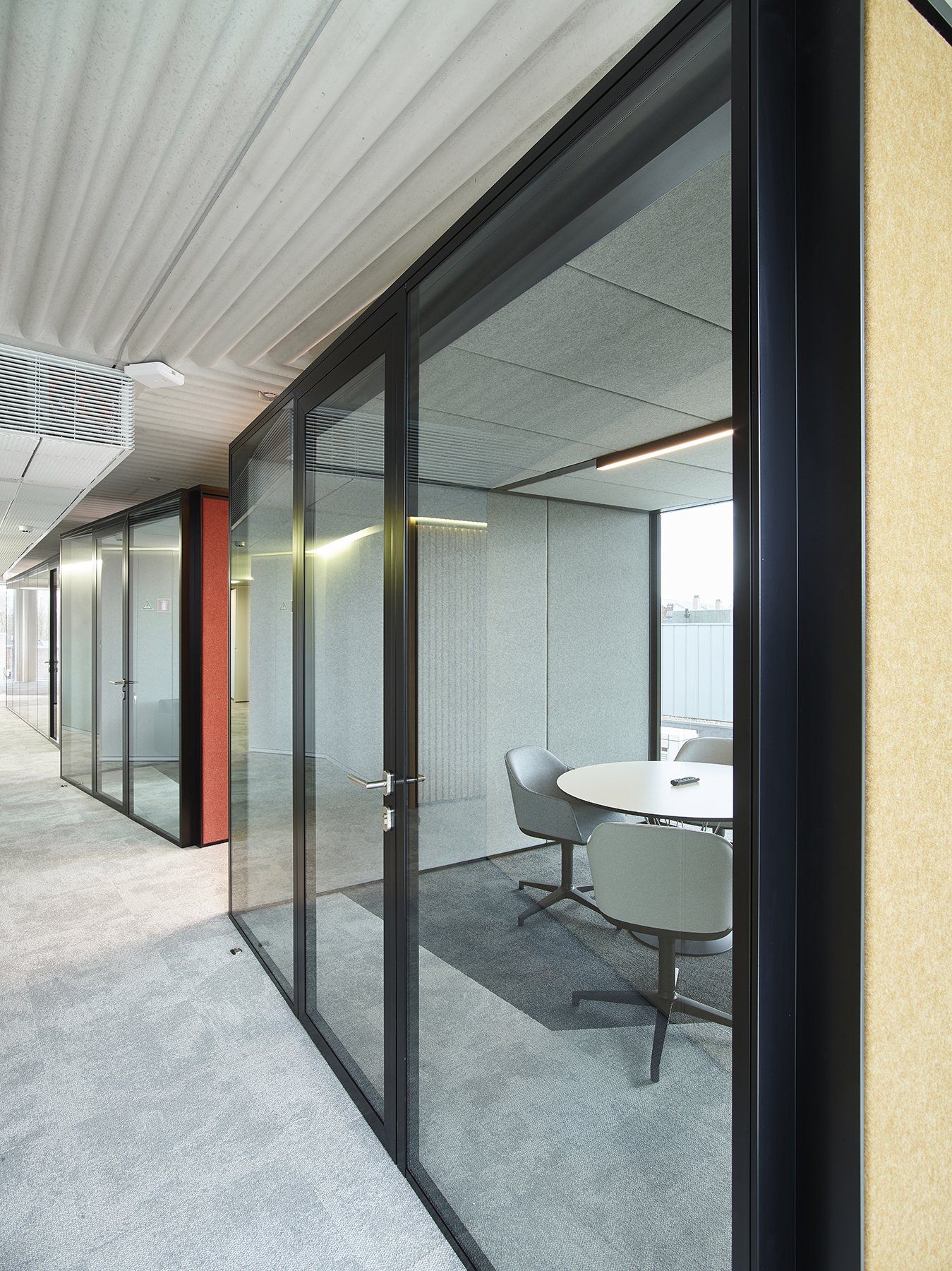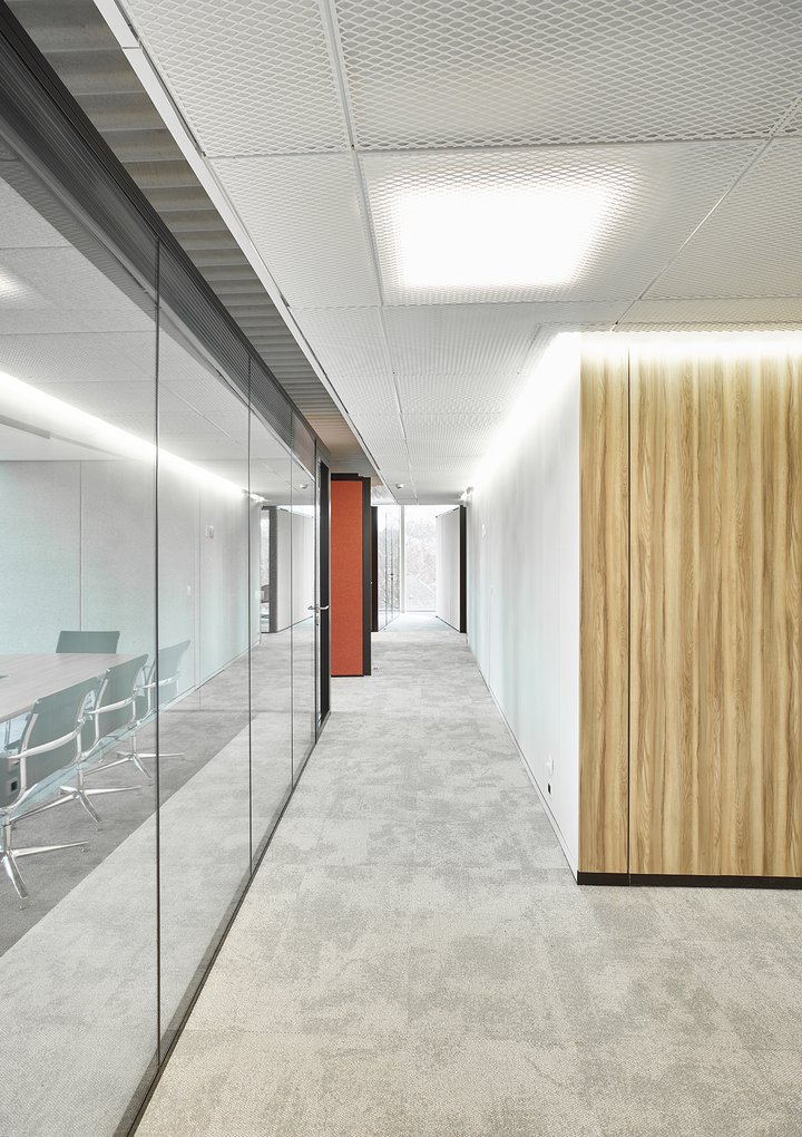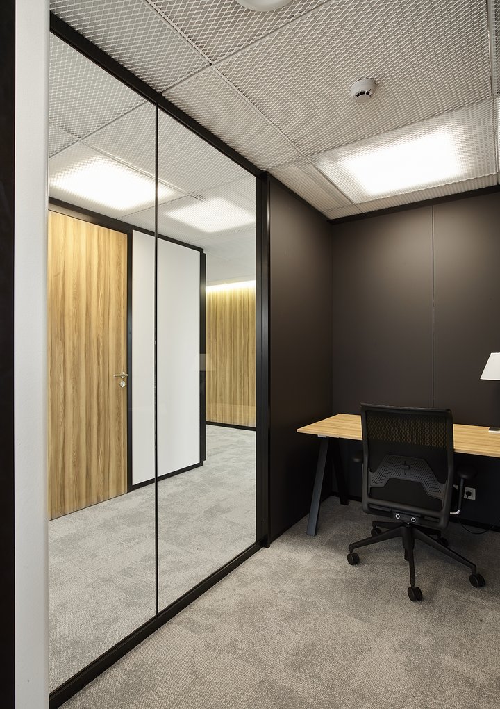 Het nieuwe werken in de JB QBE met een combinatie van de enkele glaswand JB PURE 50 en de gestoffeerde volle wand JB 2000.