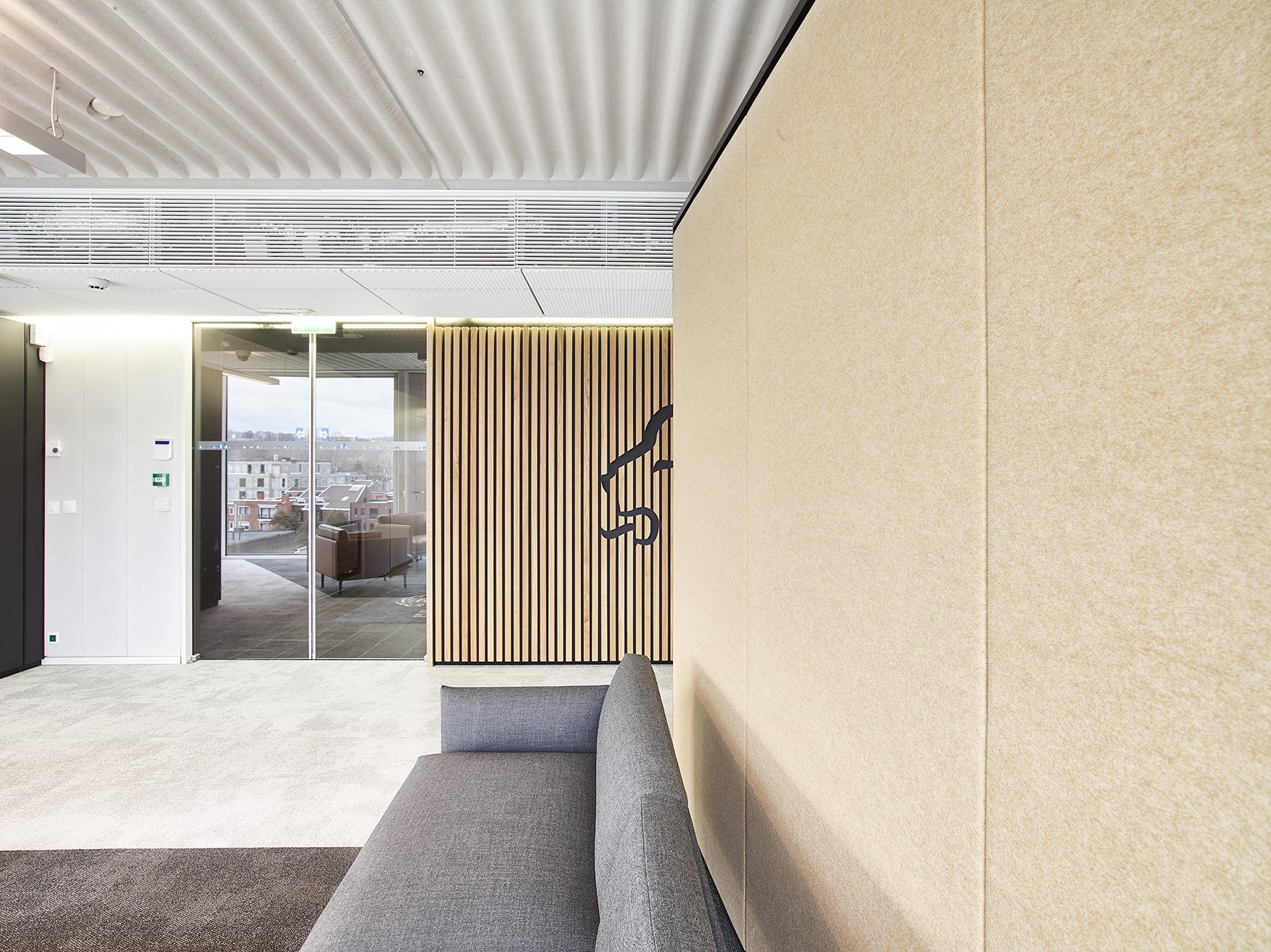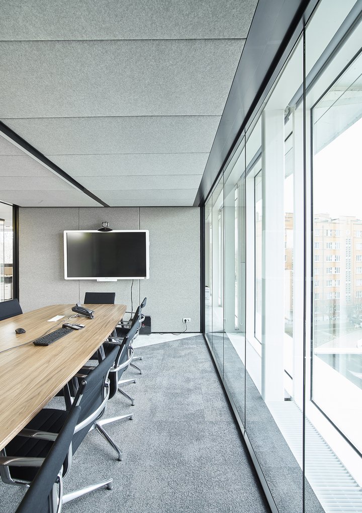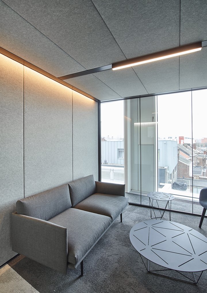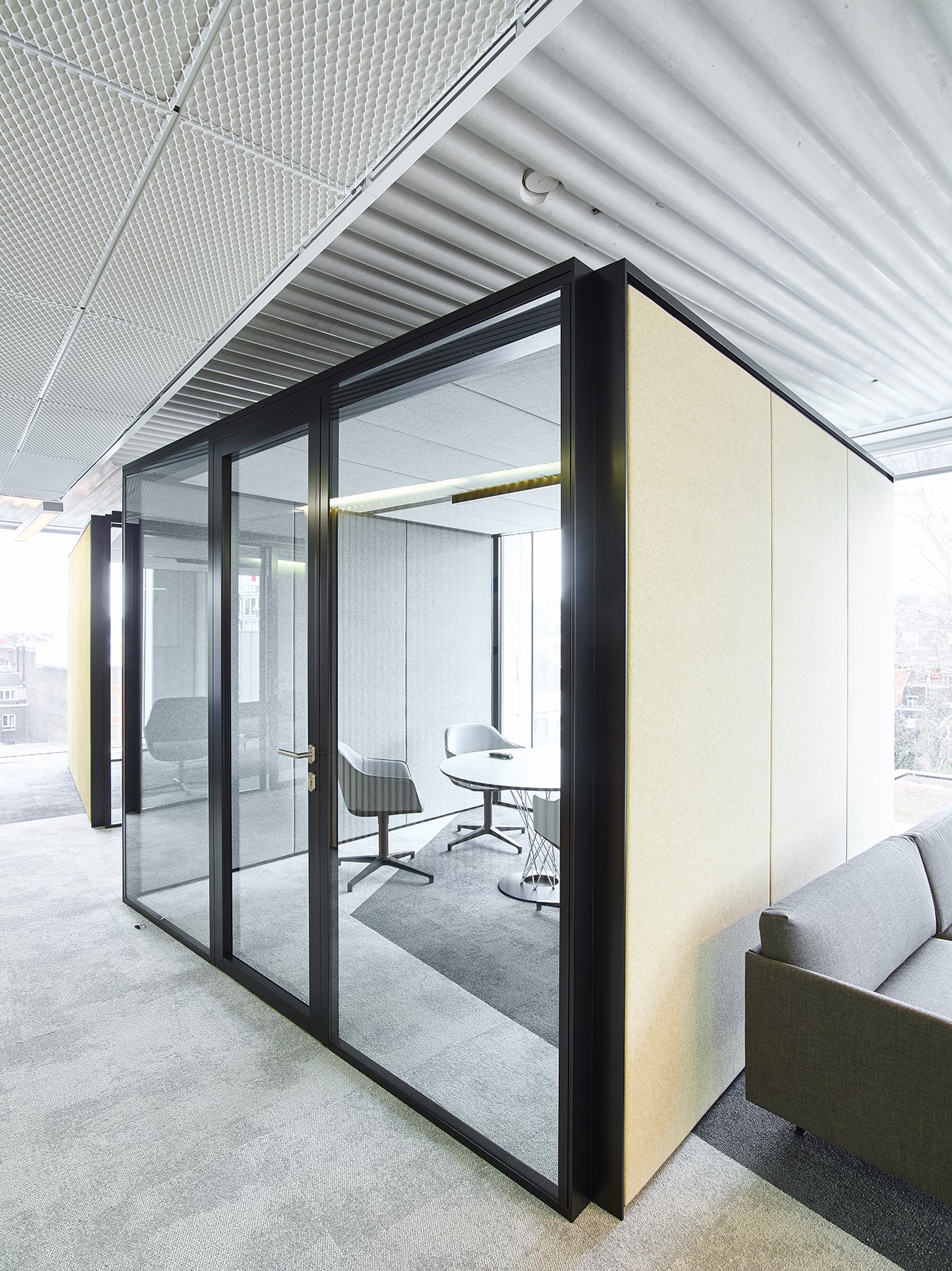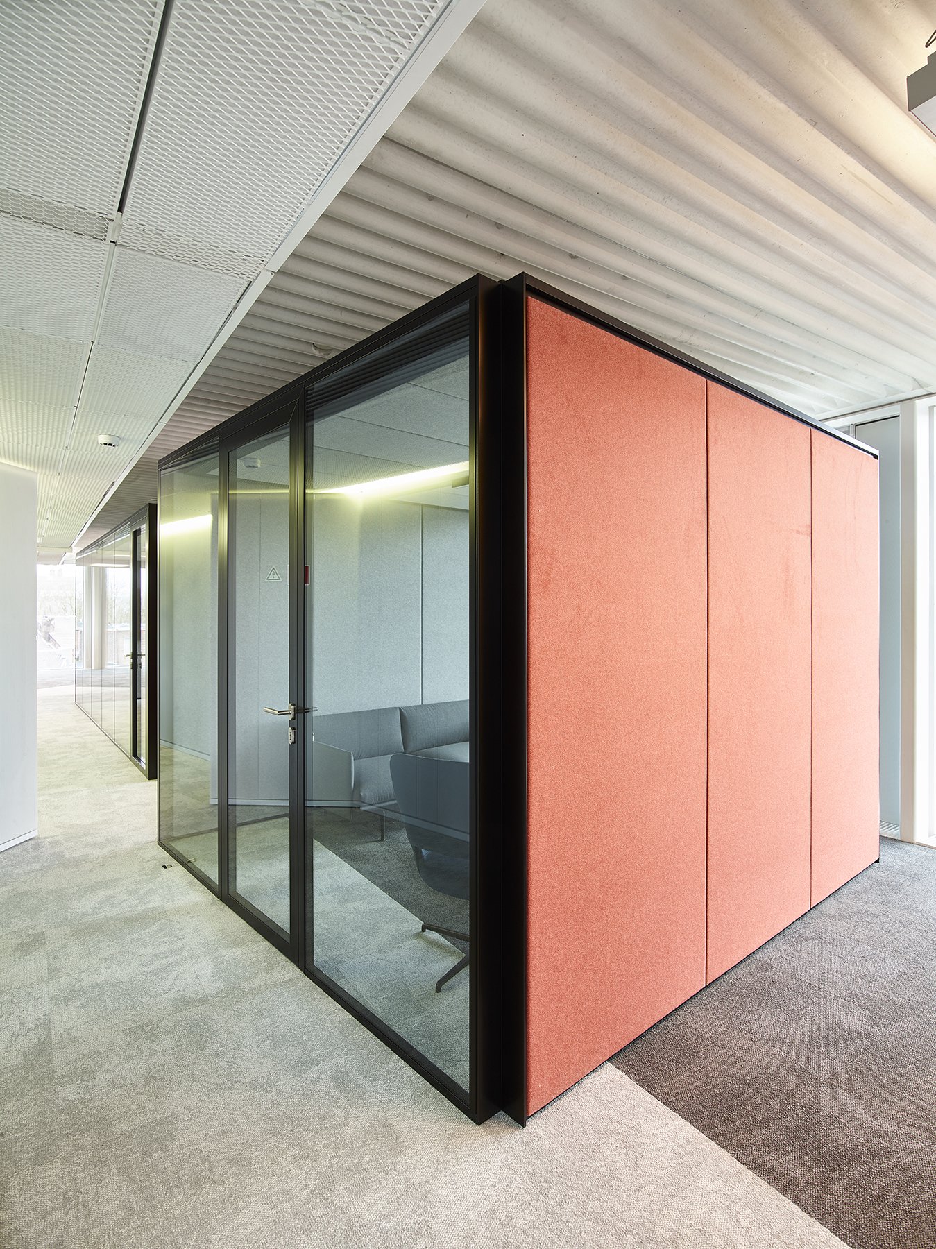 Het nieuwe werken in de JB QBE met een combinatie van de enkele glaswand JB PURE 50 en de gestoffeerde volle wand JB 2000.